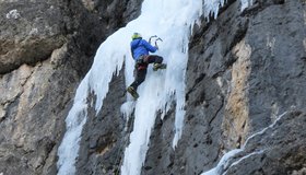 Die Tour folgt den ersten vier Seillängen der selten begangenen Schwarzen Wand Führe, die bereits 1967 von Steinkötter Heinz und Frismon Vitti eröffnet wurde. Bereits in der ersten Seillänge kamen die Eisgeräte zum Einsatz, die Schwierigkeit liegt bei ca. M5. Die vorhandenen alten Haken sollte man jedoch mit Vorsicht genießen. Die zweite Seillänge klettert man an perfekten schwarzen Fels ca. 30 m leicht rechtshaltent hoch. Auch hier trifft man auf alte Haken, man kann aber auch gut mobile Sicherungen legen. Die dritte Seillänge ist ein Mix aus Fels und Eis in der Schwierigkeit V/M5. In der vierten Seillänge befindet sich die schwierigste Felspassage der gesamten Tour. Diese folgt zuerst einen Riss zu einem kleinen Dach (die Schwierigkeit liegt ca. bei VI+) und bevor man zum Stand gelangt ist nochmals ein kleiner Eisaufschwung zu bewältigen. Die fünfte Seillänge führt zuerst unter der hängenden Eisformation links an leichtem Fels vorbei und quert dann direkt ins Eis. An diesem Punkt verlässt man die „Schwarze Wand“ Führe. Die kurze Felspassage kann man gut an Sanduhren und mit Friends absichern. Der eigentliche Eisfall ist dann ein Genuss zum klettern und weist von unten bis oben immer dieselbe Schwierigkeit auf - ca. WI6.