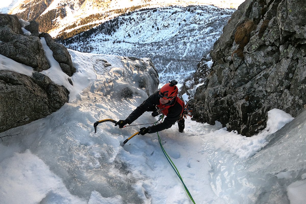 Vom Stand links haltend hinauf zum Beginn des Felspfeilers. Dort ist ein Stand an 2 Bohrhaken. Wenn dieser mit Schnee bedeckt sind, weiter nach links queren und einen Stand mit Eisschrauben machen.
