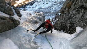 Die schmale Rinne hinauf bis zu ihrem Ende. Standplatz mit Eisschrauben.