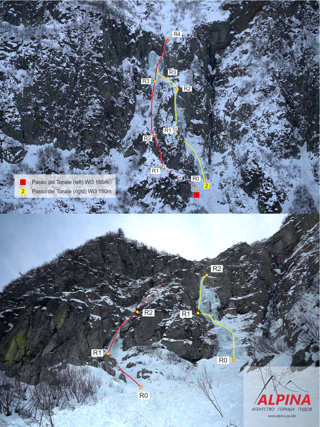 Ein kleiner Eisfall von mittlerem Schwierigkeitsgrad mit zwei Möglichkeiten (Links und Rechts). Von den beiden Routen ist die rechte Variante die interessantere. Die Nordausrichtung und die Höhe schaffen schon zu Beginn der Saison günstige Bedingungen für die Eisbildung. Die lange Anfahrt zum Passo del Tonale wird durch einen eher kurzen Zustieg kompensiert.