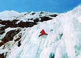 Variante B: Über den überhängenden Passagen noch vor dem Felsriegel ca. 3 SL nach links zur Abseilpiste der Gläsernen Madonna queren. Auch nicht immer leicht. Kann ein diffiziles klettern in einem schlecht zu sichernden Eis-Schnee-Gemisch sein.