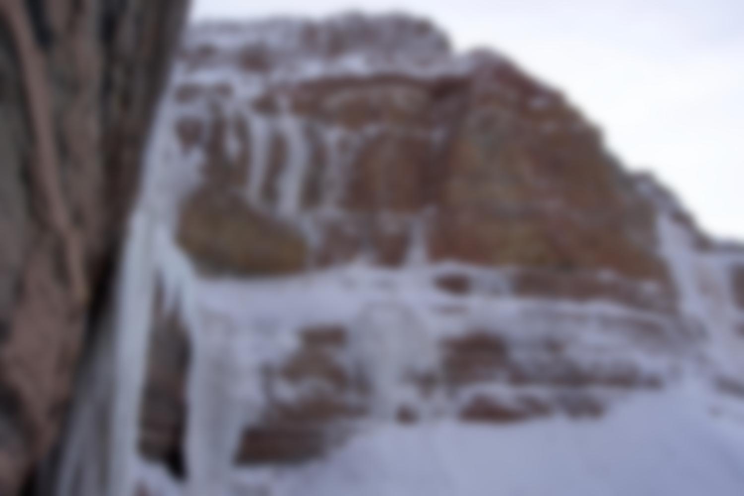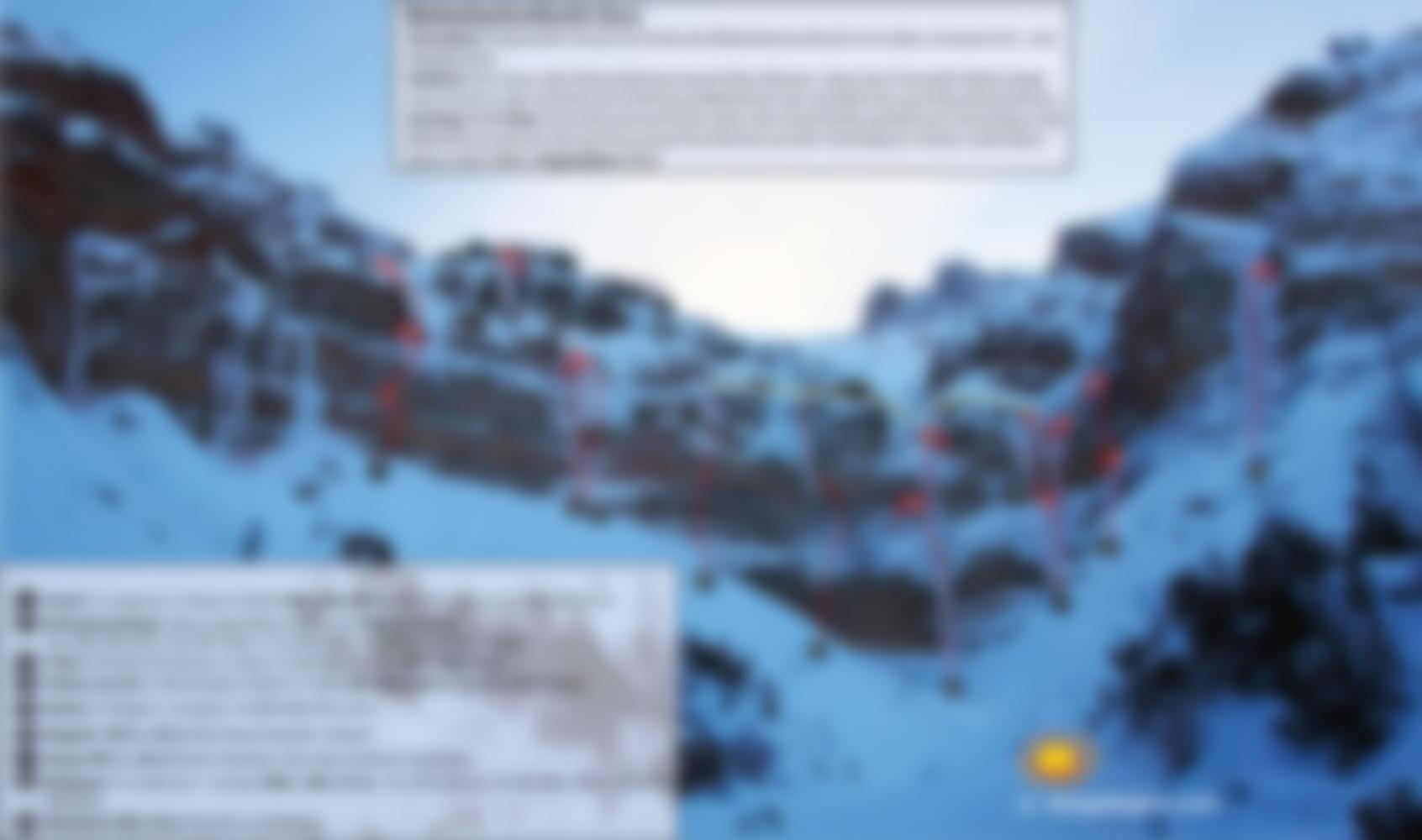 Zozza: WI 5+, 60 m Rechts Abseilen, links über Eistänzer absteigen.