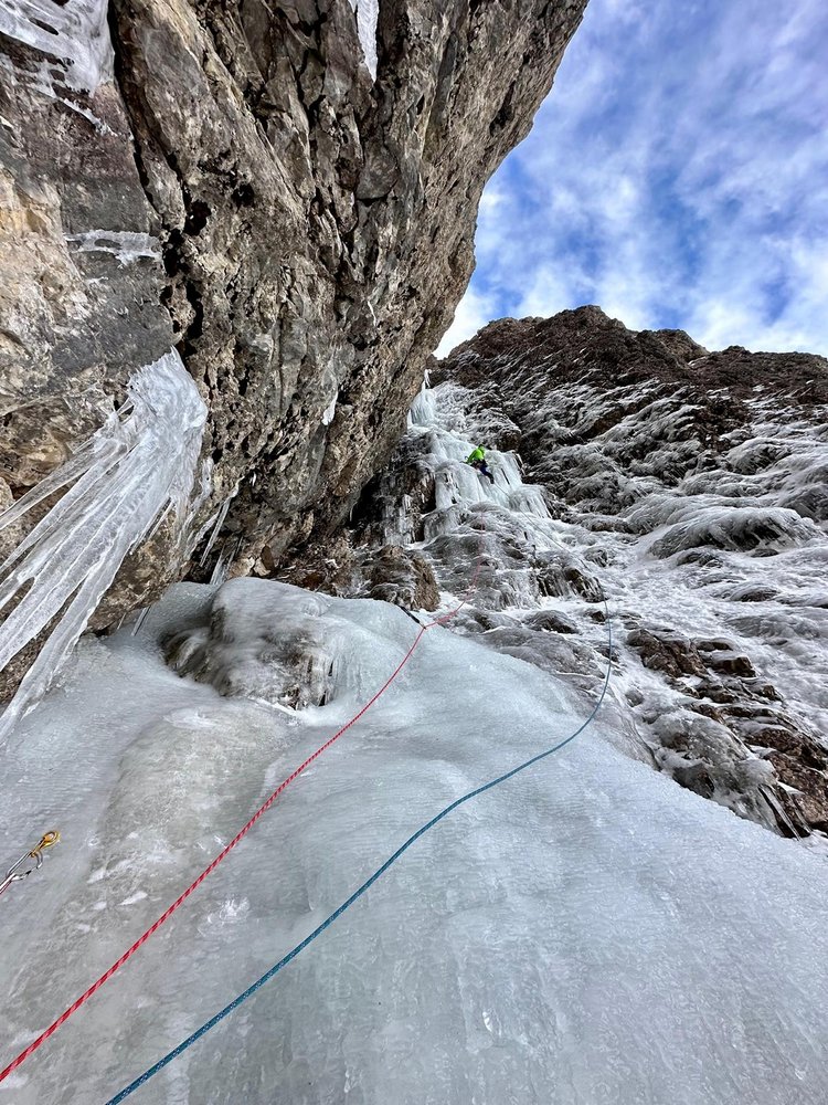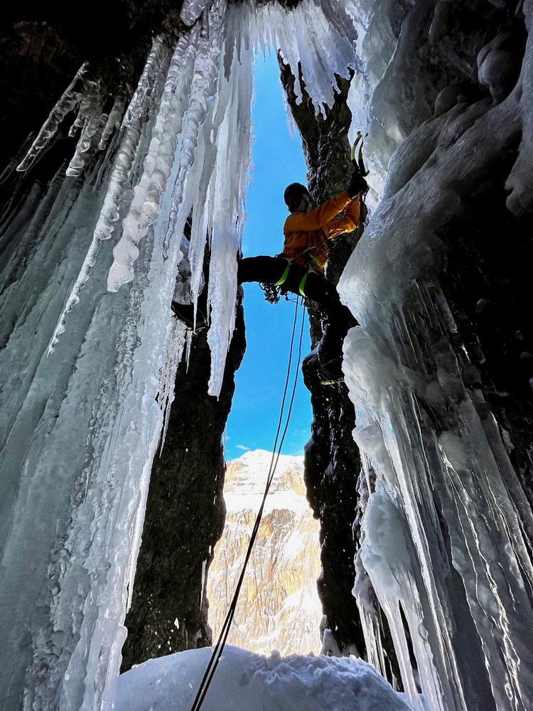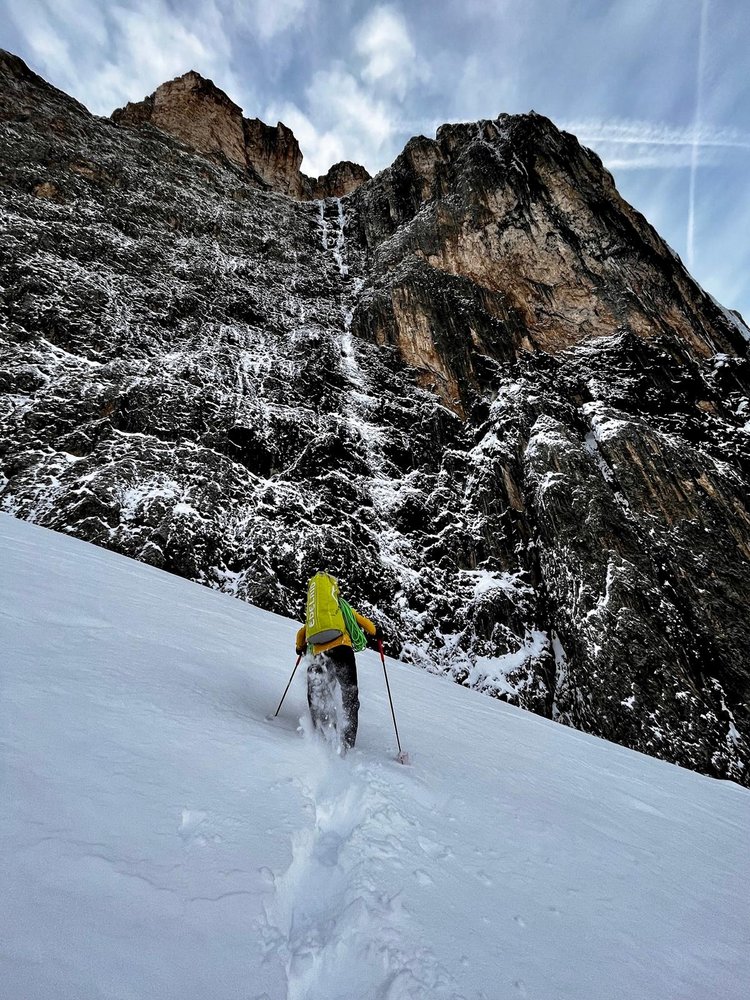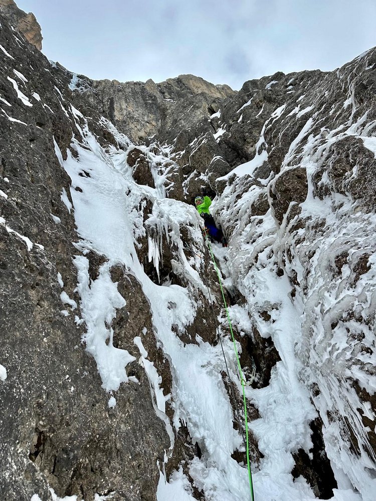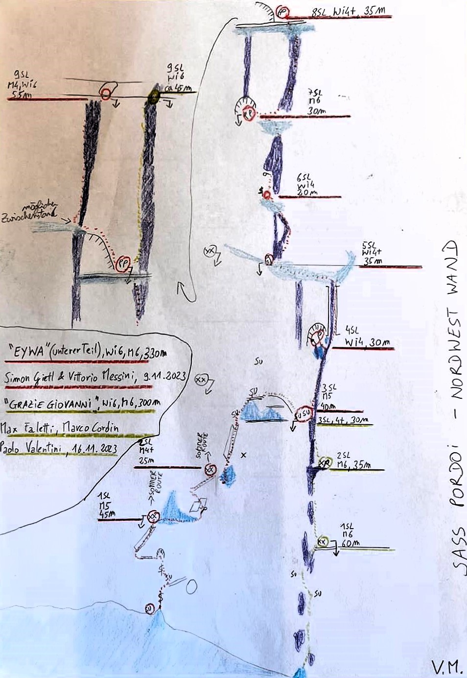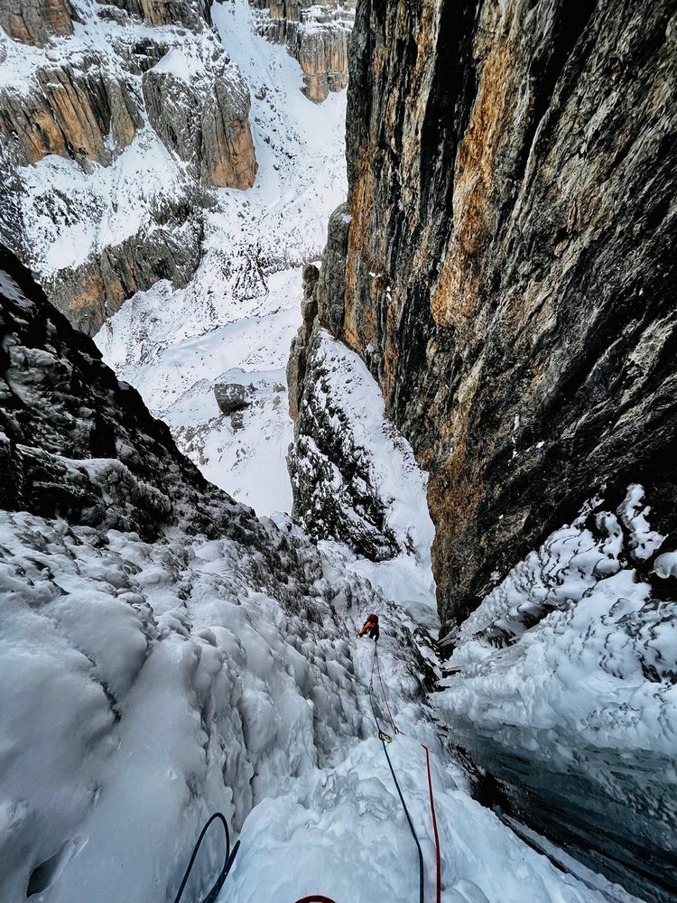 Extrem anspruchsvolle und lange Mixedline in der Pordoi Westwand. Die Route wurde von Simon Gietl und Vittorio Messini an zwei Tagen erstbegangen.
