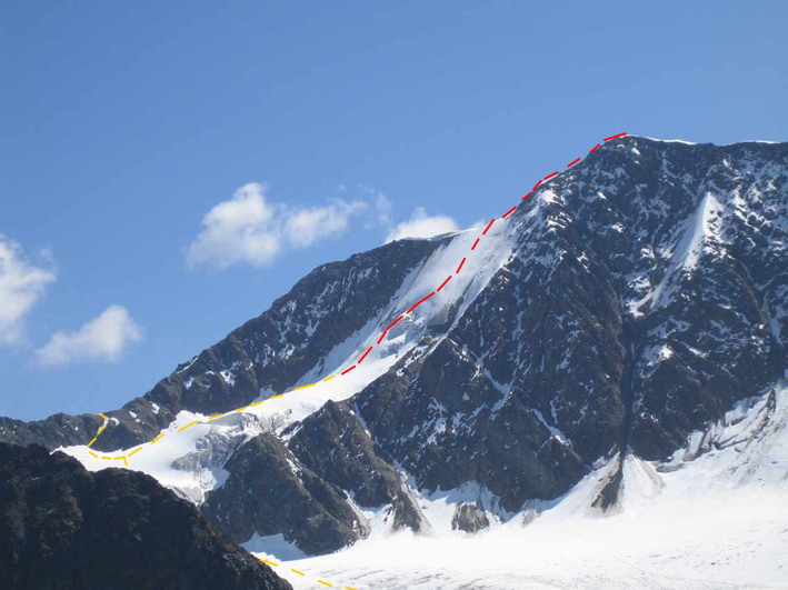 Am Einstieg von links kommend bis etwa unter die Wandmitte queren, um den potentiell durch Steinschlag und durch Wächtenbruch gefährdeten Bereich im linken Wandteil zu umgehen. Aufstieg zum Bergschrund, der die Wand nach dem unteren Drittel durchzieht, ebenfalls mittig. Die große Spalte am Bergschrund läßt sich auf einer Rampe, die schräg von links unten nach rechts oben ansteigt, sehr gut überwinden (je nach Schneelage bzw. Eisbildung). In diesem Bereich und leicht oberhalb ist auch die steilste Stelle der Wand (ca. 60 °). Nach dem Bergschrund fast direkt, leicht nach rechts ziehend auf den Grat nach oben. Auf dem Grat nach rechts unschwierig zum höchsten Punkt.