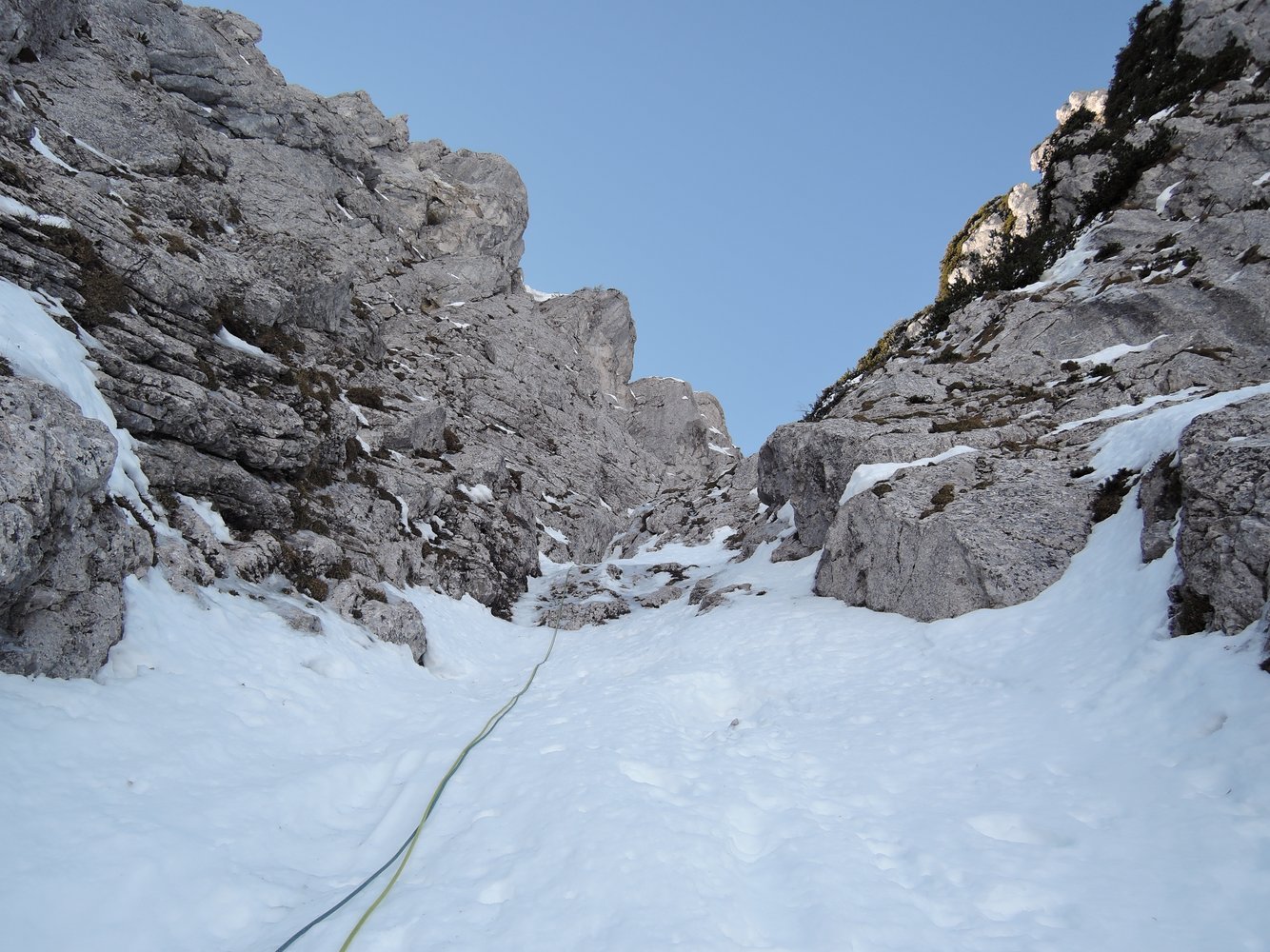 Die im Zustieg beschriebene Rinne ca.250 hm hoch. Nach 1/3 des Anstiegs versperrt ein riesiger Klemmblock den Weiterweg. Hier über die linke Rampe in kurzer leichter Kletterei (M2) ausweichen. Sobald sich das Couloir markant verengt, sollte das Seil angelegt werden. Zu anfangs kann noch über den Körper gesichert werden. Der Felsteil ist relativ offensichtlich vorgegeben und sucht sich den leichtesten Weg.