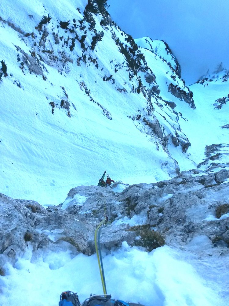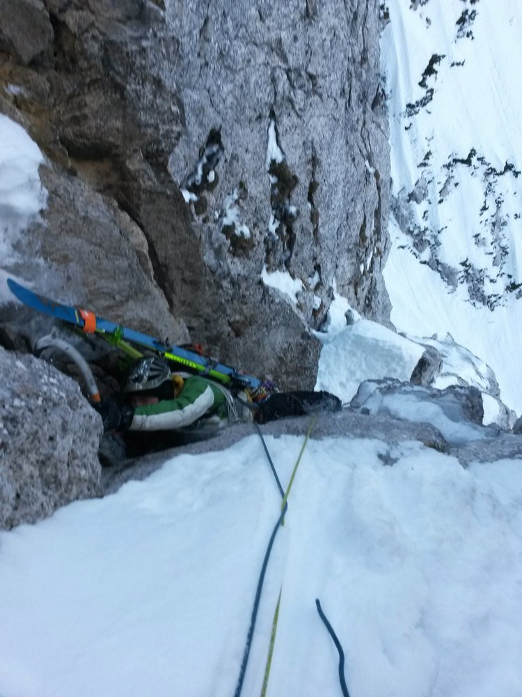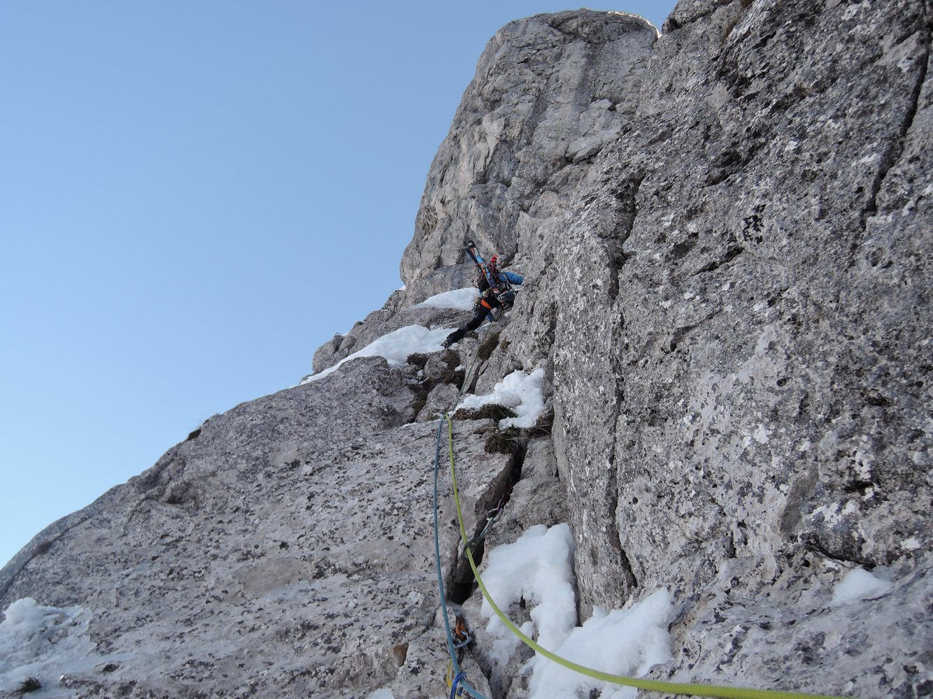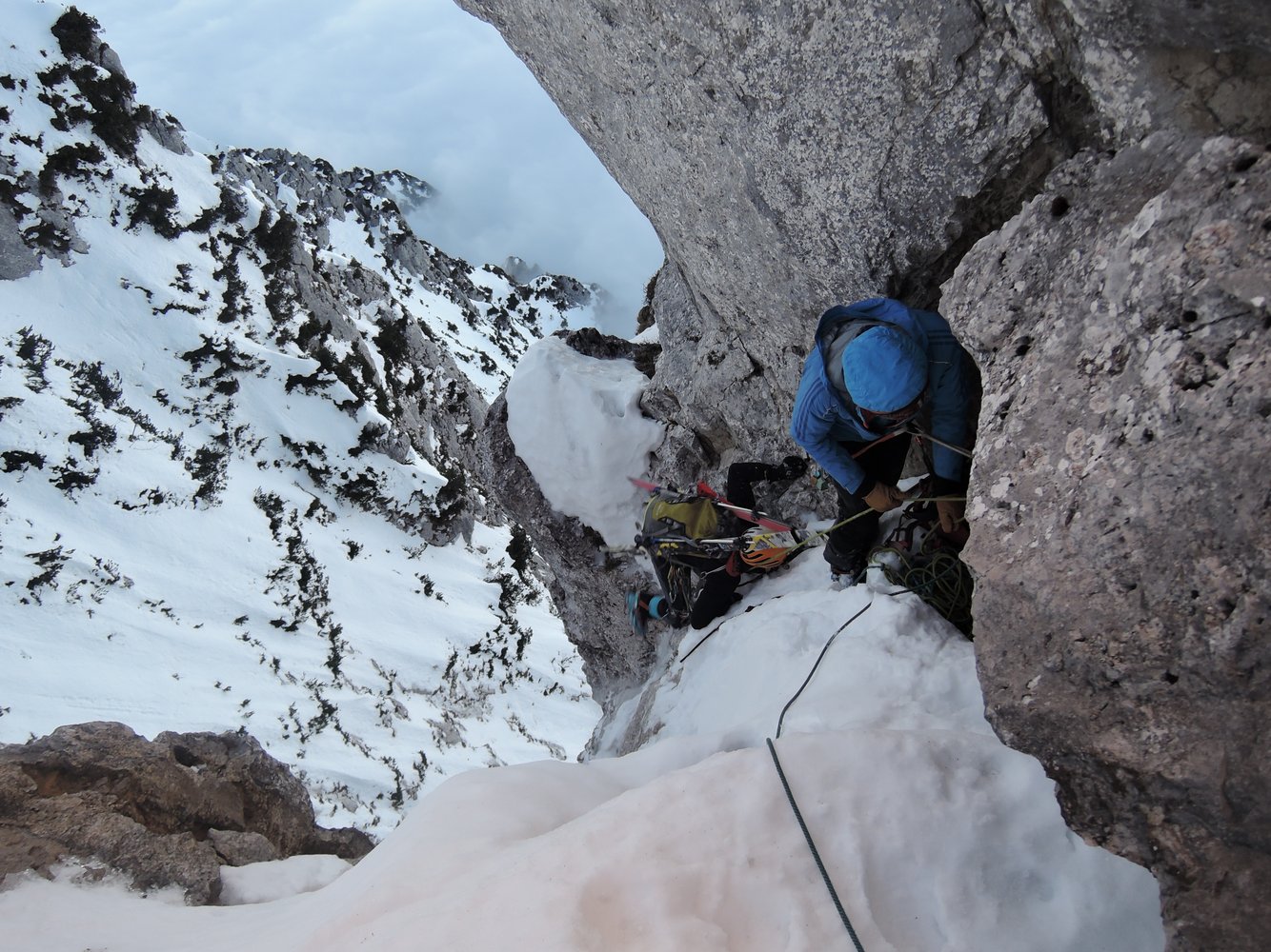 1. SL: WI4/M4: 60 ° Rinne noch weiter hoch, bis es eisiger wird. Dann Eisstufe (NH zuvor) hoch zu markanten Riss. Hier Stand (tlw. selber zu verbessern)