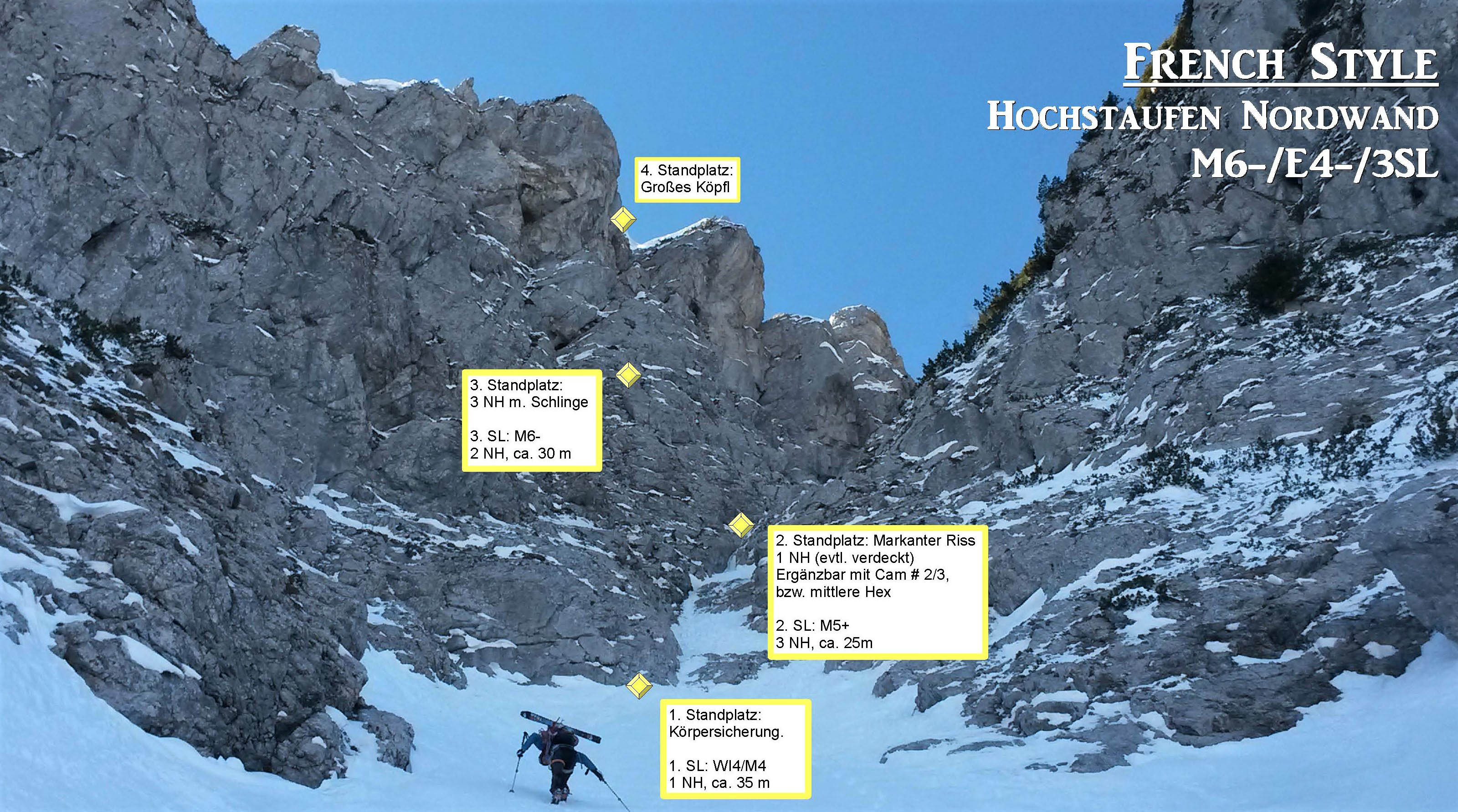 Eine anschließende, durchgehende Abfahrt über die Staufennordwand kann nicht empfohlen werden. Sollte man auf dieses Vorhaben abziehlen, wird dringend die gesamte Abfahrtsroute im Aufstieg empfohlen. Einerseits bekommt man ein direktes Feedback über die Abfahrtsspur. Andererseits trifft man das Einfahrtsband, welches von dem Gipfel herabzieht. Dieses versuchen zu treffen - ohne vorherige Kenntnis - ist sehr riskant. Aus diesen Gründen ist der Abstieg der "French Style" am besten über das Staufenkar!
