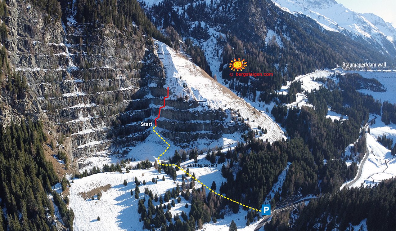 Der Gelbe Fluss ist laut der Kaunertalwebseite eine der Top 3 Eisklettertouren im Kaunertal. Nimmt man den Umstand des Klimawandels hinzu, könnte das evtl. sogar hinkommen, da der Fall recht weit oben und nordseitig gelegen ist. Wenn andere Eisfälle unten im Tal noch wenig bis gar keine Eisauflage haben, kann man im Steinbruch unterhalb der Staumauer oft schon recht passabel klettern. Die vier Steilstufen schauen von weitem recht harmlos aus, vor allem aber die mittleren beiden Stufen können ganz schön "pumpig" werden.