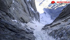 Vom Einstieg auf ca. 3100 m (kleine Randkluft) fünf Seillängen oft kombiniert gerade hoch (80°). Dann über das Haupteisfeld am rechten Rand (Steinschlag geschützt) zum gut erkennbaren Gully hoch (ca. 10-12 SL, 60- 70°). Am Beginn des Gullys Schlüsselstelle durch wenig Eisauflage (WI 6+ oder schweres Mixedgelände) in sieben Seillängen bis zum Ausstieg am Hirondelles Grat auf 4.100 m (bei uns perfektes Steileis WI 5). Den Grat bis zum Gipfel folgen.