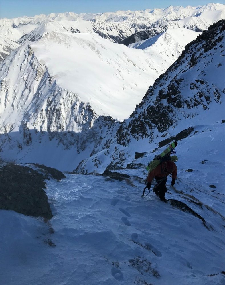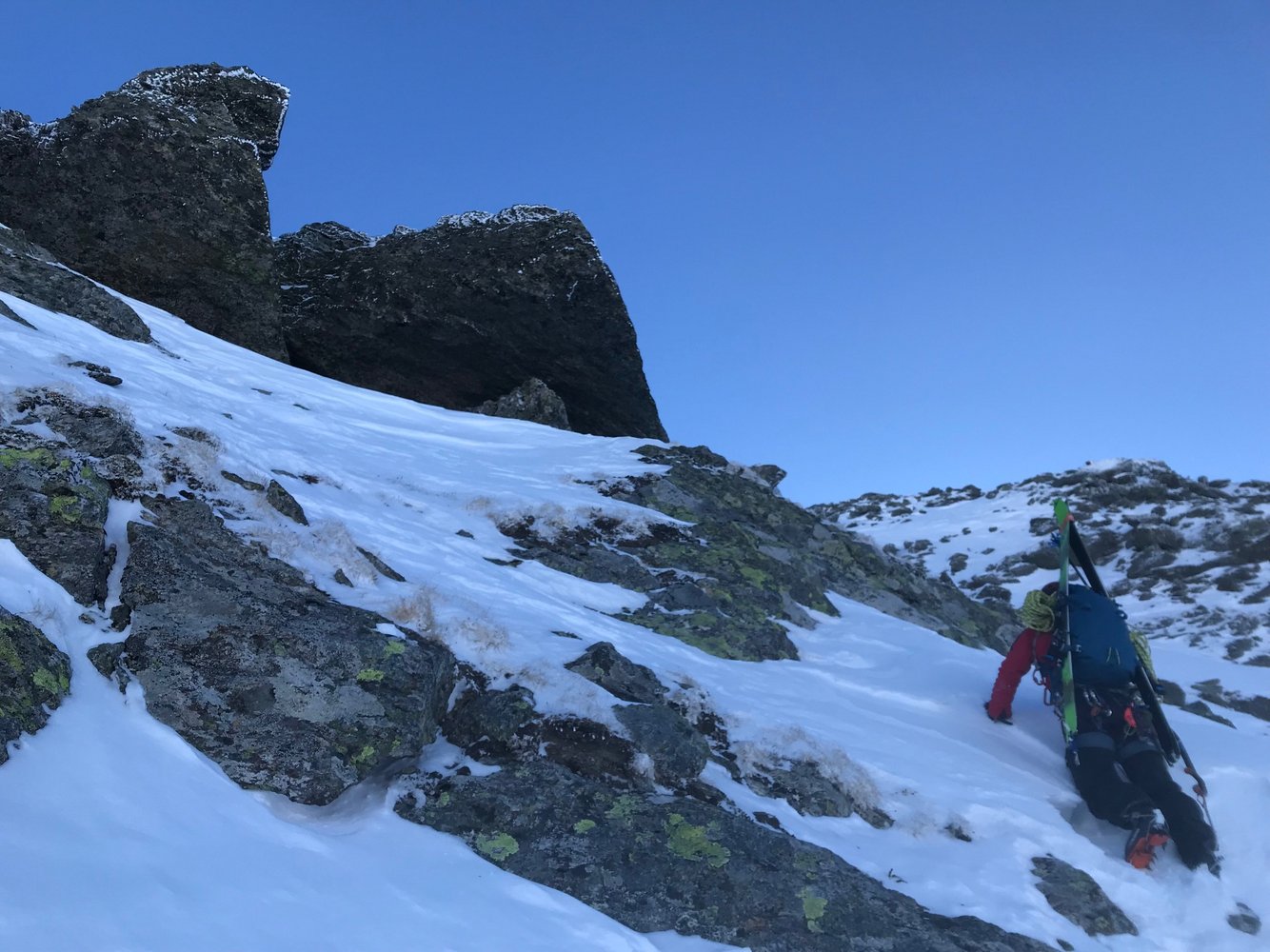 Kombinierte alpine Tour mit ca. 120hm Eiskletterei (Wi3-Wi4+) und 600hm leichte, durch Gehgelände unterbrochene, Gratkletterei (1-2). In der Gesamtheit mit Skizustieg und -abstieg langer und konditionell fordernder Anstieg in abgelegener und beeindruckender Bergkulisse.