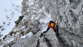 4. SL: Je nach Schneelage Stapfgelände oder Latschenkletterei bis zum Ende der Wand.