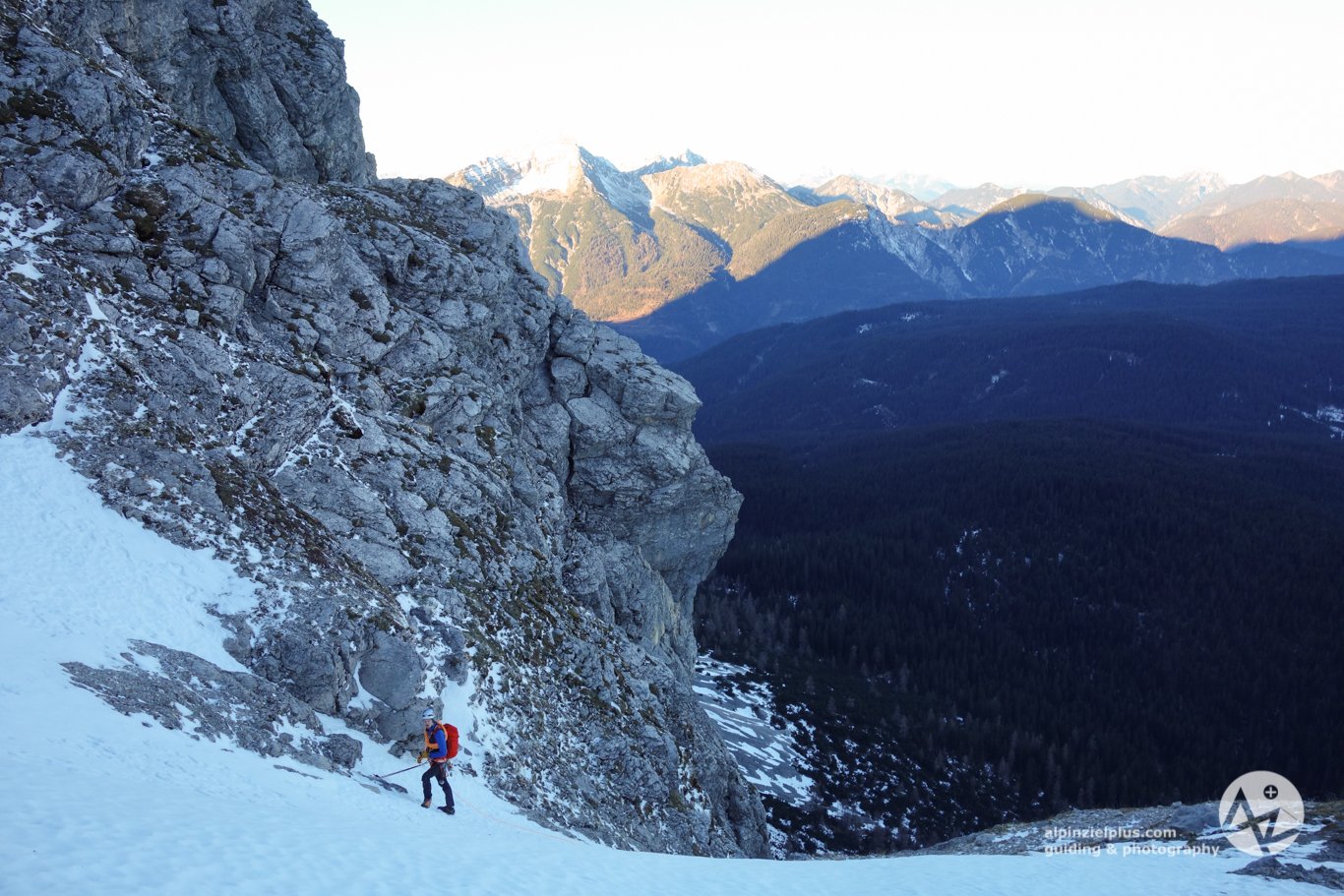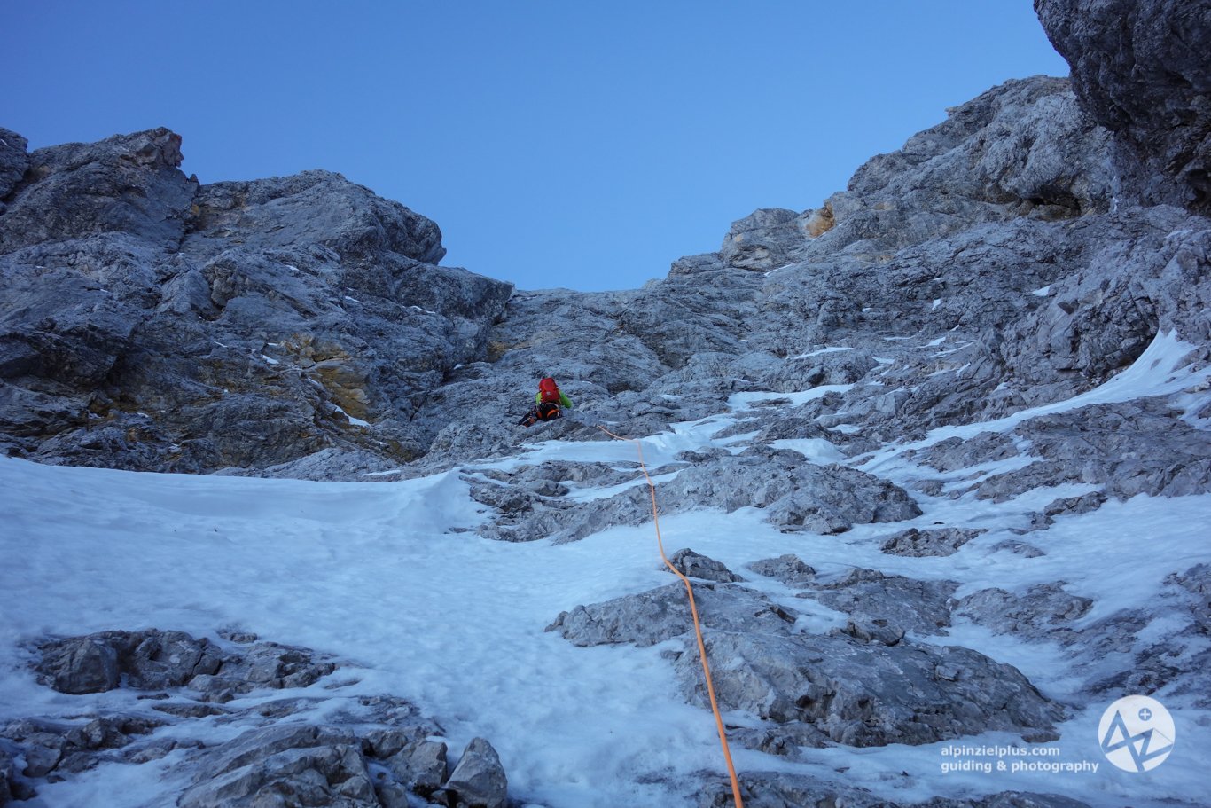 Das Kar steigt man empor, bis sich vor einem die steile Wand erhebt. Am rechten Rand kann man bei guter Schneelage über einen Eisschlauch ein weiteres Schotterfeld erreichen. Bei wenig Schnee hält man sich etwas weiter rechts und erreicht das Schotterfeld in leichter Kletterei. Nun muss man sich weit links halten und erreicht den nächsten plattigen Aufschwung dort, wo von links unten eine steile Rinne aus der Wand heraufzieht. An einer leicht ausgeprägten Rippe, die der Wand vorgelagert ist, findet sich ein Standplatz mit zwei Normalhaken. Direkt dahinter, jenseits der Rinne zieht ein kurzer steiler Riss hinauf (M5+, Fixkeil und Normalhaken). Diesem Riss folgen und anschließend links haltend einen Standplatz mit zwei Normalhaken erreichen. Nun wird die Kletterei wieder leichter (M3-4). Man hält sich stark links und quert die Seilbahn. Je nach Schneelage klettert man über eine kurze Wand ab oder seilt an einem Normalhaken in die Schneerinne.