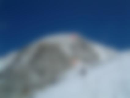 Über den Bergschrund und dann durch die Wand - man hält sich links um oben den Felsen etwas auszuweichen. Beim Ausstieg gelangt man auf einen Firngrat und kurz danach in ein Firnbecken. Über dieses zum Gipfelblock und über leichten Grat zum höchsten Punkt.