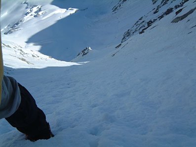 die Randkluft kann ein großes Problem werden. Sicheres Gehen in steilen Eiswänden, Konzentration auch im Abstieg (Fels bis II), bei genügend Schnee mit Schi eindeutig leichter.