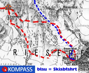 Bei guten Verhältnissen können die Schi bis zum Gipfel mitgenommen werden. Für Steilwandfahrer ist zwar auch eine Direktabfahrt (55° und anfangs recht schmal) möglich, lohnender ist es jedoch ein Stück über die Westflanke abzufahren und bei einem kleinen Sattel in die NW-Wand einzubiegen