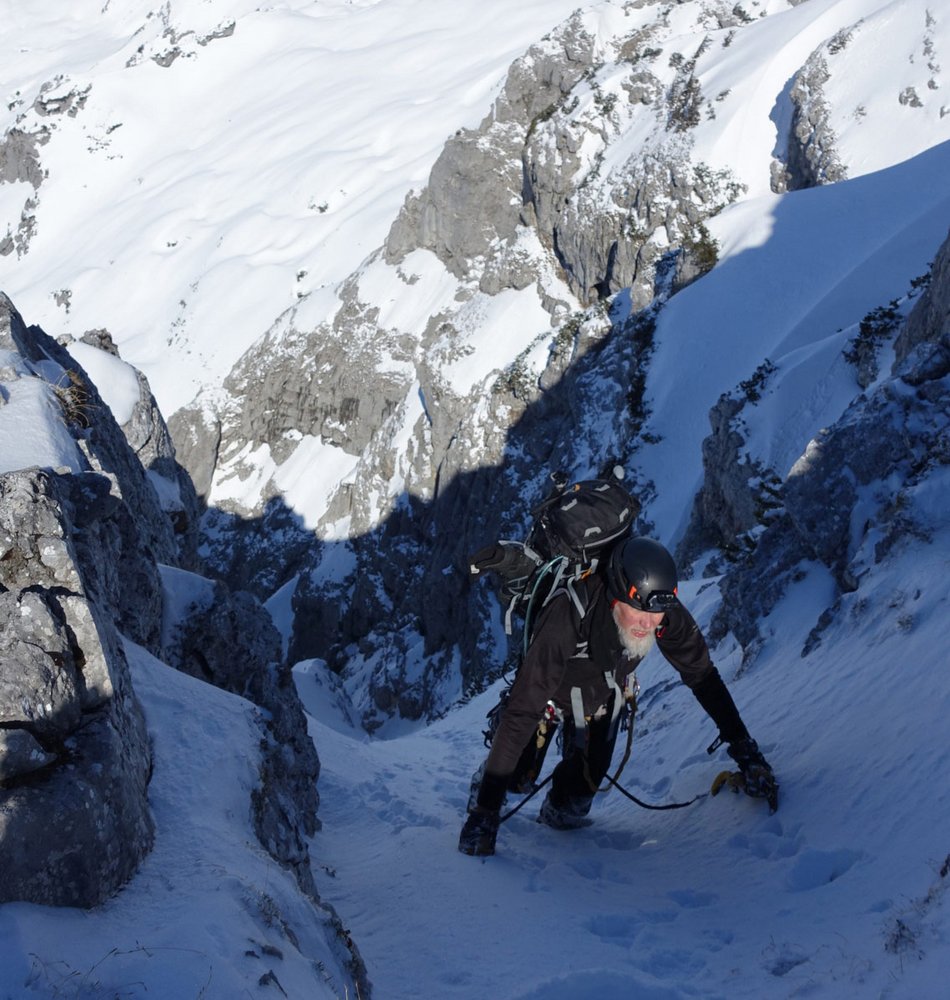 Nachdem man sich beim „Jausenstein“ die Eisausrüstung angelegt hat, steigt man auf dem Schneeband die „Große Schlucht aka Scherengraben“ nach oben. Sollte diese nicht vollständig gefüllt sein, können Kletterstellen bis IV auftreten, insbesondere der „Lochdurchstieg“ wäre zumindest alleine dann problematisch. An der Gabelung zum „Schlund“ wendet man sich nach links und stößt auf eine meist schneefreie wasserüberspülte Platte. Diese kann direkt überklettert (Fels III) oder links über gefrorenes Grasgelände (II) umgangen werden. Kurz danach steilt die Schlucht kurz auf. Dort findet sich eventuell eine bis zu 25 m hohe Felsstufe (III) die mobil (Peckers) gesichert werden muss oder man weicht über eine braune, brüchige Querung (2 NH,III ) über links aus. Jetzt hätte man auch Gelegenheit zum Gipfel des Sulzkogels nach links auszuqueren. Die Route zieht aber mit dem Schneeband leicht nach rechts und steil nach oben. In direkter Linie ist nun der enge Eingang zur Südschlucht erkennbar. Sollte Stein- und Eisschlag eine Begehung unmöglich machen, kann jetzt die Variante des „Winter Normalwegs“ gewählt und über eine Stufe rechts erreicht werden (siehe Topo). Andernfalls steigt man nun in die eigentliche Hauptroute ein. Je nach Schneemenge ist die teils sehr enge und steile Schlucht teils oder im Idealfall komplett mit Lawinenschnee gefüllt und dieser gut komprimiert. Es empfiehlt sich die Passage sehr früh in Angriff zu nehmen, schon ab dem späten Vormittag liegt das obere Einzugsgebiet in der Sonne und entlädt sich bei Taggang komplett durch die enge Schlucht. Man hält sich grundsätzlich völlig geradeaus senkrecht bzw. soweit rechts wie möglich. Gleich zu Beginn zweigt links eine schmale Klamm ab, diese führt aber nicht zur Headwall sondern schwierig zum oberen Teil des Westgrats. Auch eine Gabelung weiter oben mit einer Stufe nach links wird diese nicht verfolgt, man steigt immer in der Linie des „fallenden Tropfens“ bzw. Eisschlags nach oben, bis man schließlich sehr spektakulär auf einem kleinen Grat mit phantastischer Aussicht steht. Dann leicht rechts nach oben queren, bis die Headwall sichtbar wird und unter dieser wieder zurück nach links, bis ein Durchgang auf einem breiten Band zum Gipfelplateau führt. Am höchsten Punkt befinden sich das Gipfelkreuz und das Wandbuch. Die Tour ist unter idealen Bedingungen in 6 h zu schaffen. Wenn die Schneeverhältnisse nicht passen, kann die Tour aber schnell ungangbar werden.