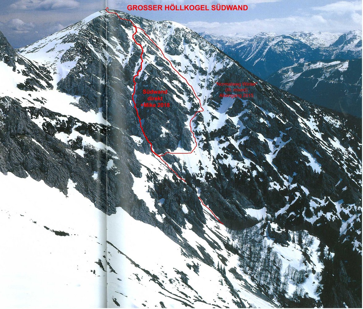 Eine Begehung der großen Höllkogel-Südwand unter winterlichen Bedingungen zählt zu den absoluten Highlights des Höllengebirges, ist aber aufgrund der komplexen Bedingungen ein nicht ungefährliches Unterfangen. Denn nur an wenigen Tagen im Frühjahr bildet sich vom Gipfel bis zum Höllkessel ein beinahe durchgehend begehbares Schnee/Eisband aus Lawinenschnee, welches sogar die „große Schlucht“ vollständig füllt. Mit wenigen Felsstellen bis III ist dann ein Durchstieg durch die gesamte Südwand bis zum Gipfel möglich.Achtung ! Es ist unbedingt auf die Schneeverhältnisse und den Taggang zu achten. Die Route ist im Winter extrem lawinengefährdet. Die gesamte Südwand entlädt sich genau entlang dieser Linie. An sonnigen Tagen sollte man bereits lange vor Sonnenaufgang starten und bis Mittag den Gipfel erreicht haben. Auch geringe Neuschneeauflagen ergeben bei Kälte aufgrund des großen Einzugs eine ausreichend tödliche Lawine und mit Stein- und Eisschlag ist in den Schluchten grundsätzlich zu rechnen. Die Felspassagen sind wenn nicht brüchig dann gefroren und lassen sich praktisch kaum absichern. Sie müssen mit Eisausrüstung oder mit bloßen Fingern und Bergstiefeln geklettert werden. Die Route ist teils ausgesetzt und verlangt seilfreie Moral."