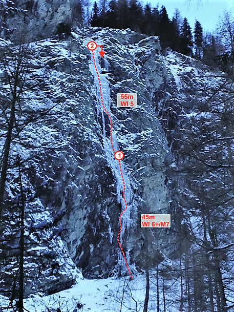 Spektakuläre Mixedlinie, die gefinkelte Mixedkletterei in sehr gutem Fels und auf Eisglasuren bietet. Es sollte unten schon einiges an Eisglasuren vorhanden sein, sonst wirds richtig schwer. Auch der Eispart oben ist gar nicht so leicht. Die Mixedlänge ist mit 5 Bohrhaken und 2 Normalhaken relativ gut abgesichert, einige Stellen lassen sich mit C3s noch entschärfen. Die Tour lässt sich ideal mit Thors Hammer bzw. MEIN SCHATZ kombinieren, die direkt rechts vom Icebreaker liegen.?Achtung: Wie bei allen anderen Fällen im hinteren Seebachtal ist auch hier die starke Lawinengefährdung aufgrund des großen Einzugsgebietes oberhalb zu beachten (auch der letzte Hang im Zustieg ist recht steil). Dabei die südseitige Exposition beachten!