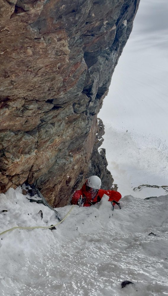 Seillängen 6–7: Moderater Schnee-/Eisrinnenanstieg, dann über eine Felsstufe zu einem großen Schneefeld in der Südostwand, wo die Route endet.