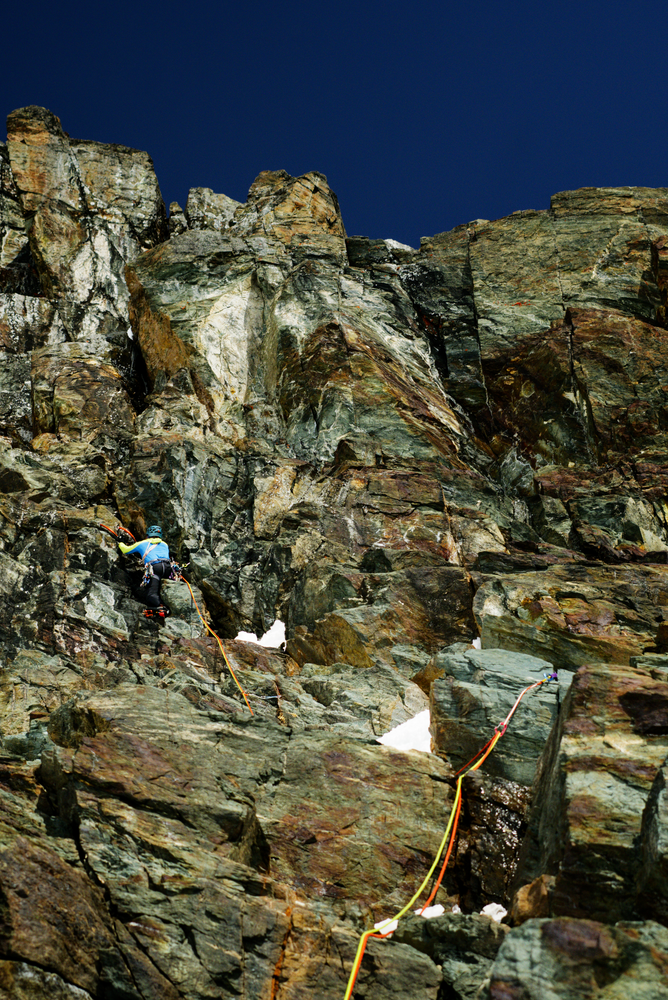 Gemischtes, aber überwiegend „Drytool“-artiges Gestein, sehr gerade Linie vom Fuß der Wand bis zum Gipfel des Klein Glocker.