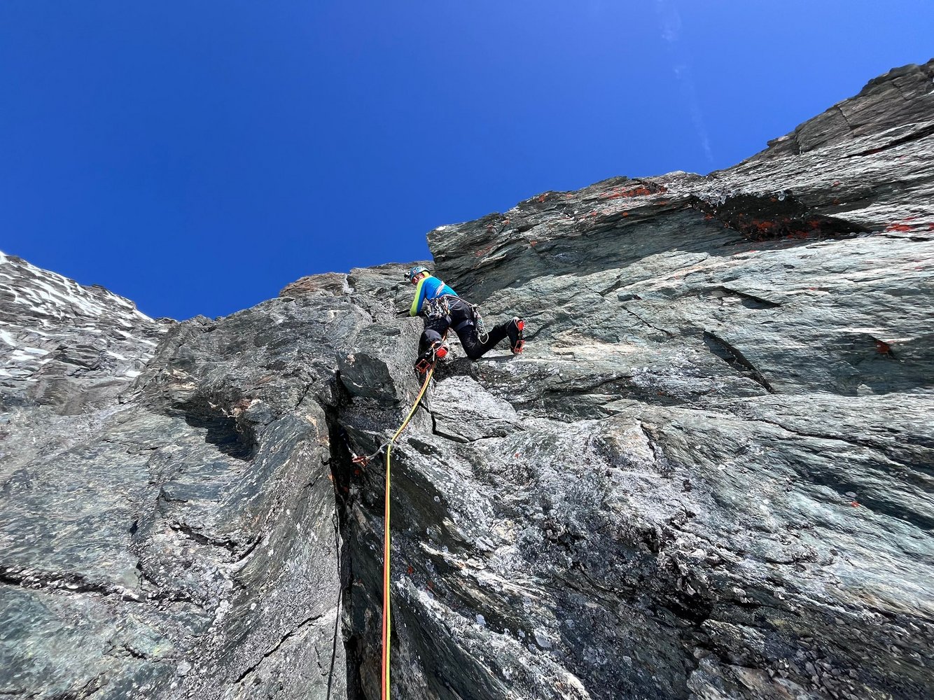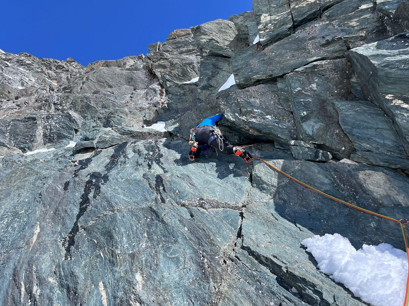 Die Route ist 500 m lang und relativ ausgeglichen mit einer Schlüsselstelle in drei Seillängen, die an Pirana in der Hohen Tatra erinnert. Es handelt sich dabei um eine schöne, überhängende Ecke mit einer guten Spalte, aber schwächeren Tritten. Weiter geht es mit einer leichteren Seillänge ins Schneefeld und anschließend zum Pfeiler, der direkt zum Kleinen Glocker führt. Mehrere Platten- und Spaltenpassagen im Schwierigkeitsgrad M4+ bis M6, der Einsatz von Eispickeln für tiefere Griffe oder das Treten auf wenige Millimeter schmalen Tritten, Spalten und geschichtetes Gelände führen uns allmählich zu den Schneefeldern unterhalb des Gipfels. Den Großglocker selbst erreichen wir mit einer normalen Seillänge. Wir haben einen Steigeisen am Aussichtspunkt am Ende der siebten Seillänge zurückgelassen.