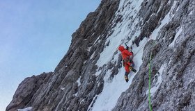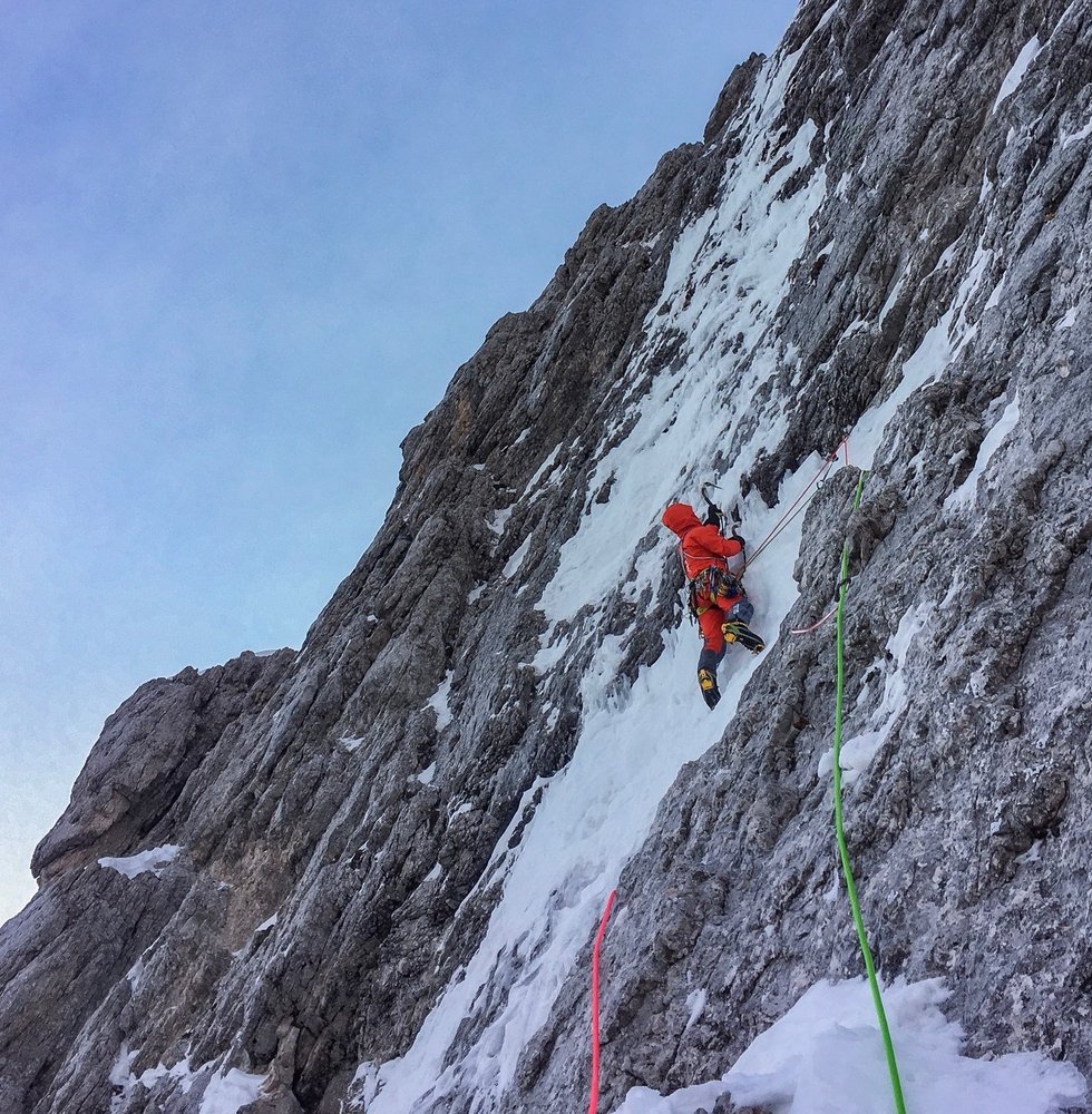 Anspruchsvolle und schwierig zu sichernde Mixed Route in der Peitlerkofel Nordwand über eine imposante Eisspur.
