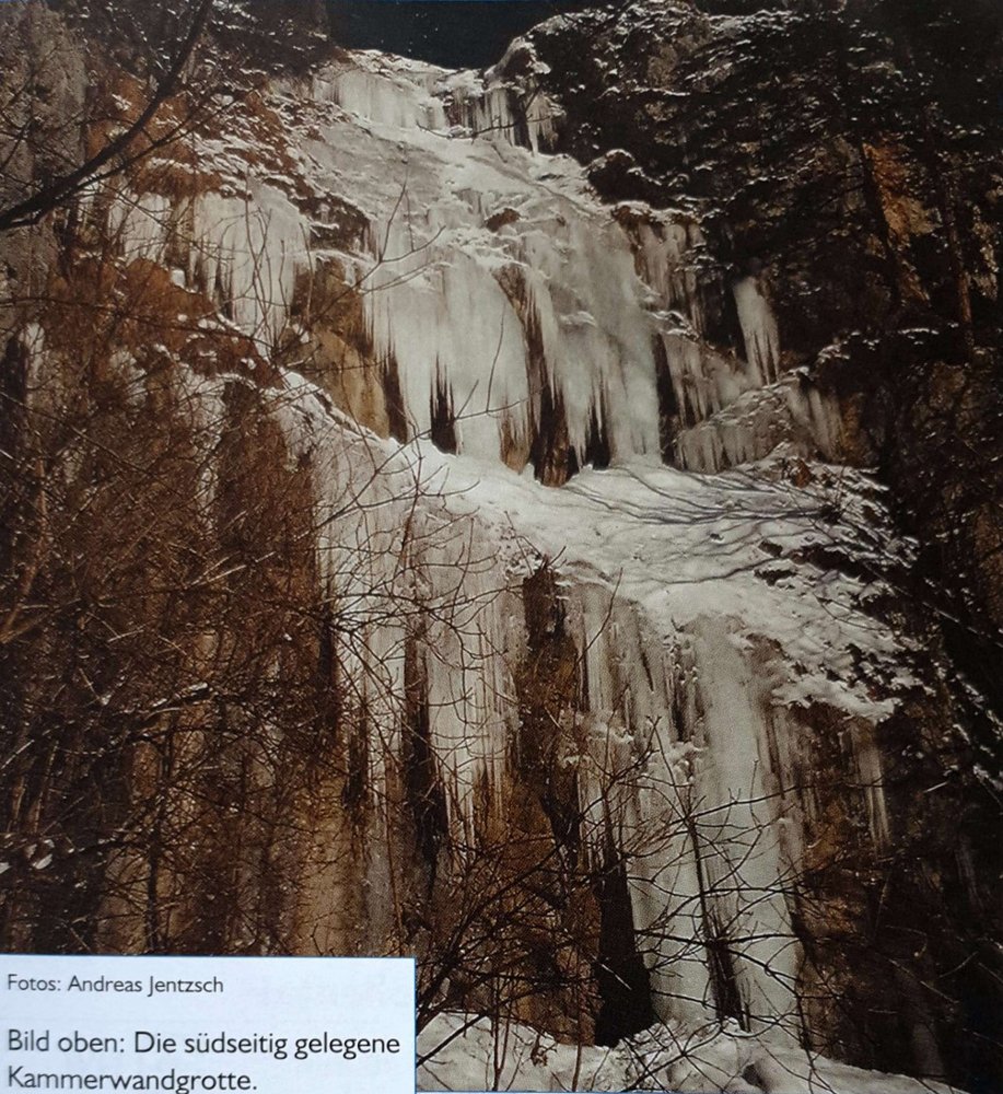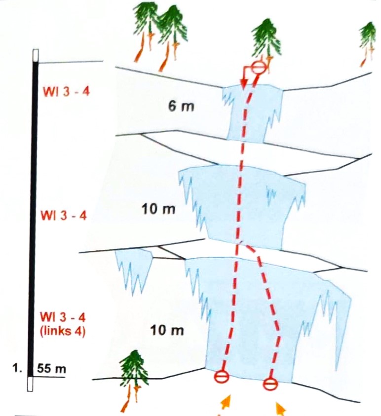 Netter südseitiger Übungsfall bei der gleichnamigen Grotte. Der Fall hat drei kurze Seillängen und ist nur nach einigen sehr kalten Tagen begehbar.
