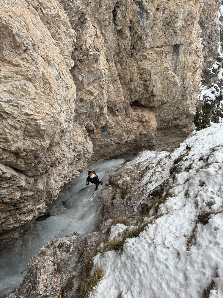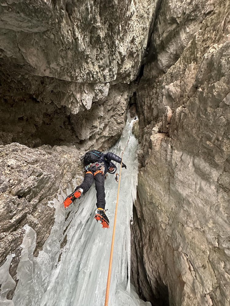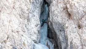 Dem Kanal über leichte Stufen und immer dicker werdendes Eis folgen. Stand links an Schlaghaken auf einem Band WI4 55m