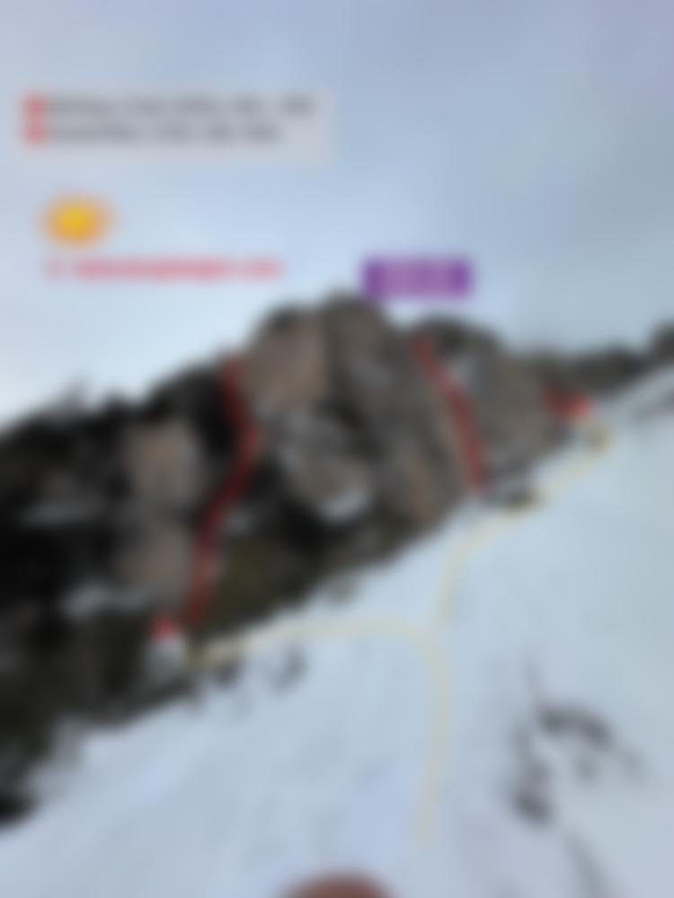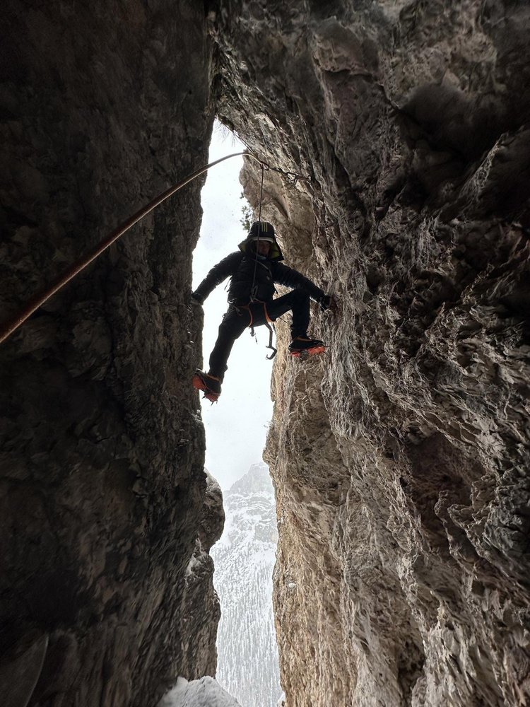 Diese markante Verschneidung stach mir schon einige Male ins Auge, jedoch konnte ich immer nur wenig Eis darin entdecken und somit stieg ich nie ein, um sie zu erkunden. Als jedoch Mathieu mit seinem Gleitschirm drüberflog und einen guten Einblick in die Tiefe Verschneidung hatte, erzählte er mir von dem Eis darin. Somit war uns klar wir mussten diese Linie klettern. Wir fanden keine Begehungsspuren und auch nach Recherchen konnte ich keine vorherige Begehung ermitteln.