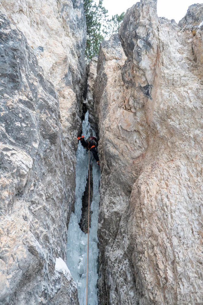 Vom Stand über delikates Eis und dann kurze Überwindungspassage im Fels aus der Verschneidung und Stand an kleinen Baum. M5+ WI5 30m