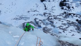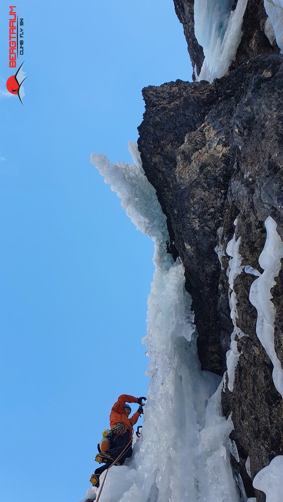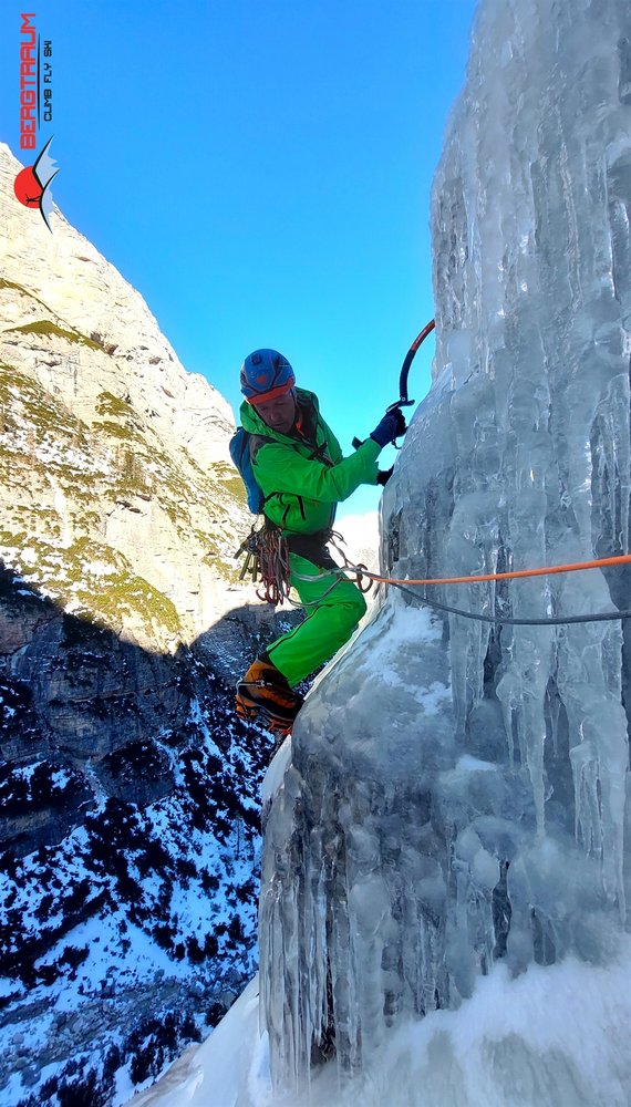 Wunderschöner Eisfall in imposanter Umgebung- Zustieg kann je nach Schneeverhältnissen lang und etwas unbequem sein. Mehrere Möglichkeiten zum Klettern. Ganz links gibt`s die Tour „Cascata di Irene“- WI 5, 180 m und „Cascata di Primavera“- WI 4+ mit rund 130 m Länge.