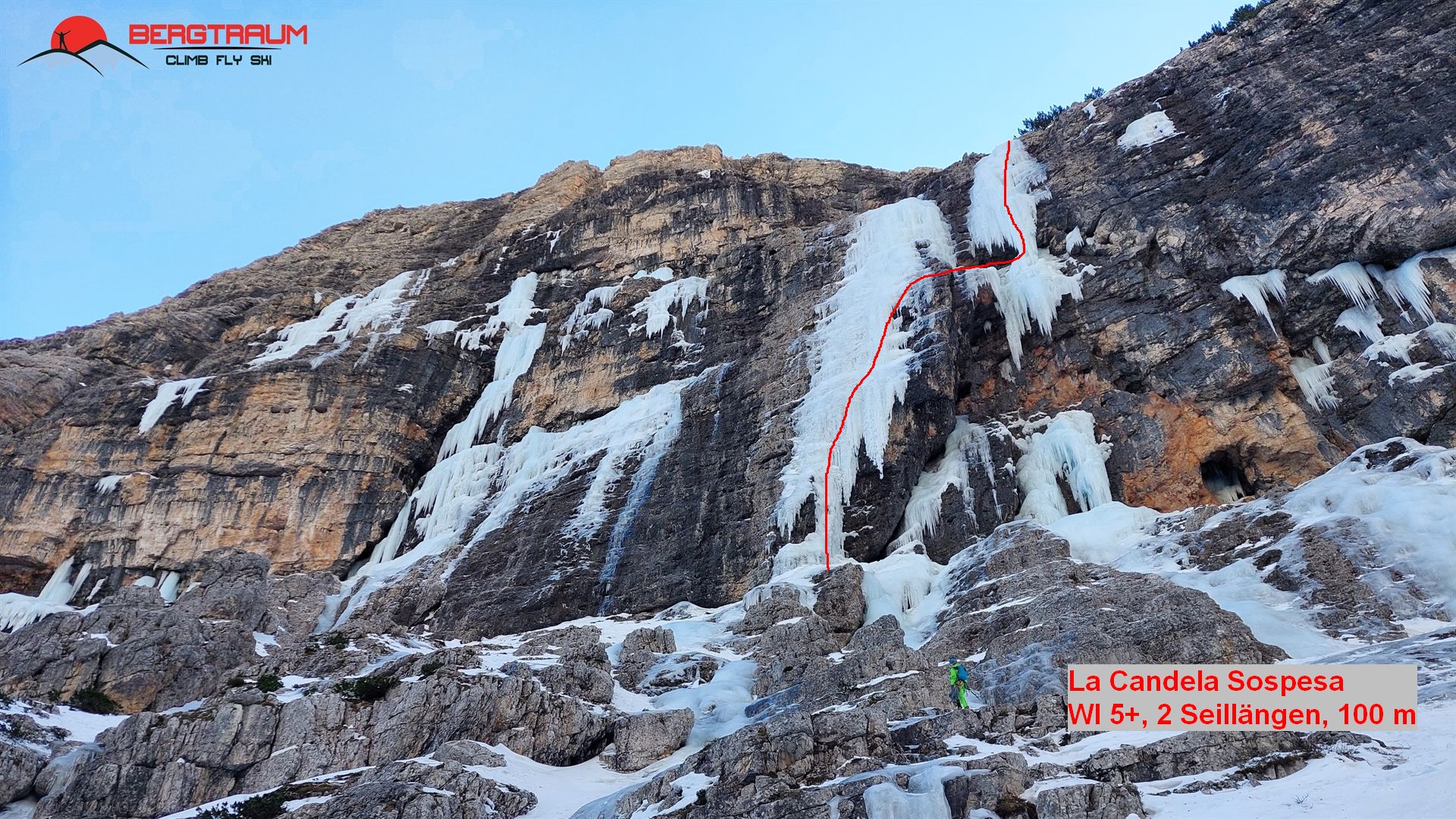 La Candela Sospesa ist eine steile Linie ganz rechts in der Hauptwand. Der freistehende Zapfen oben ist oft dünn und schwer absicherbar. In guten Jahren soll der Zapfen bis runter gehen.