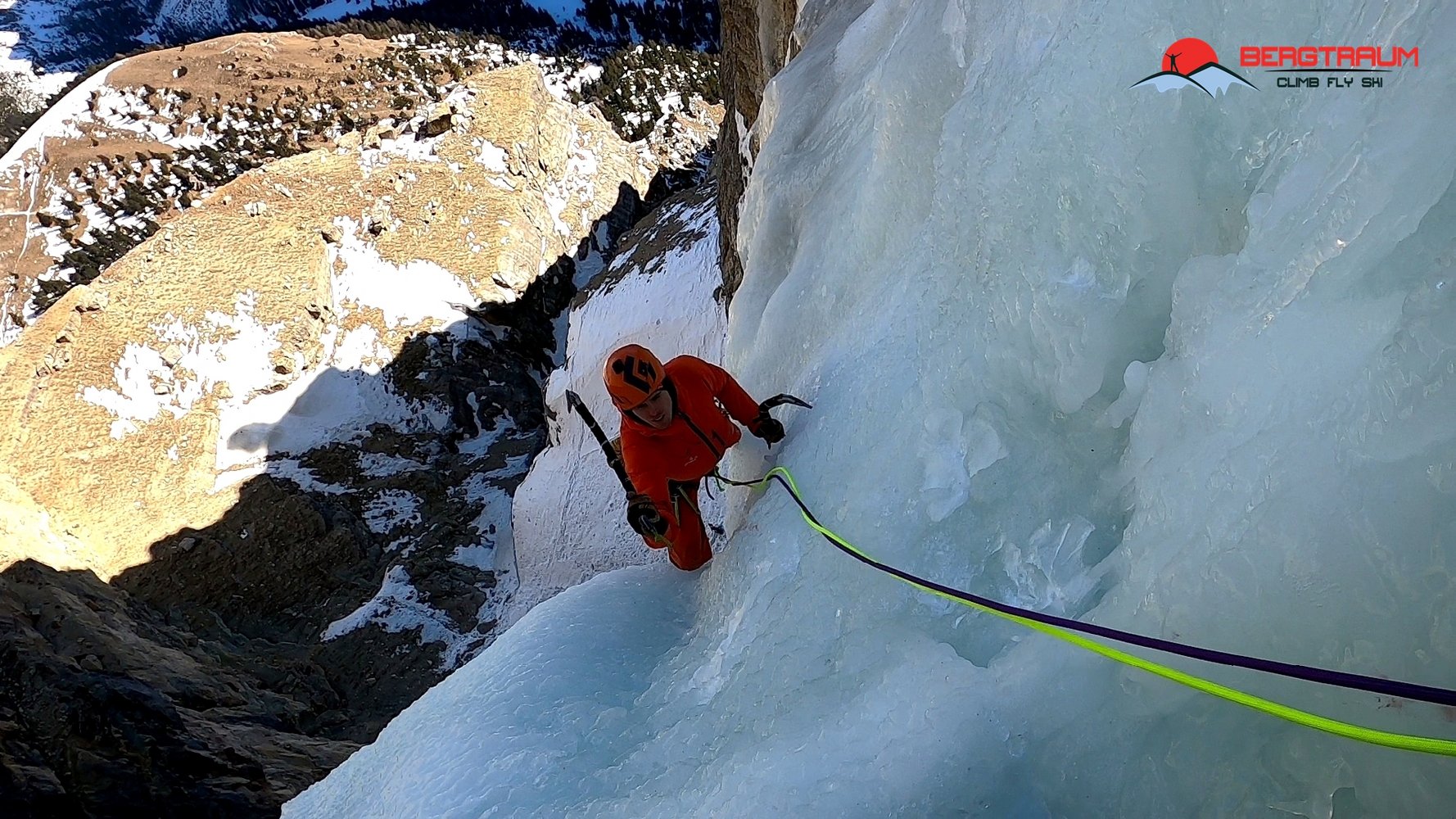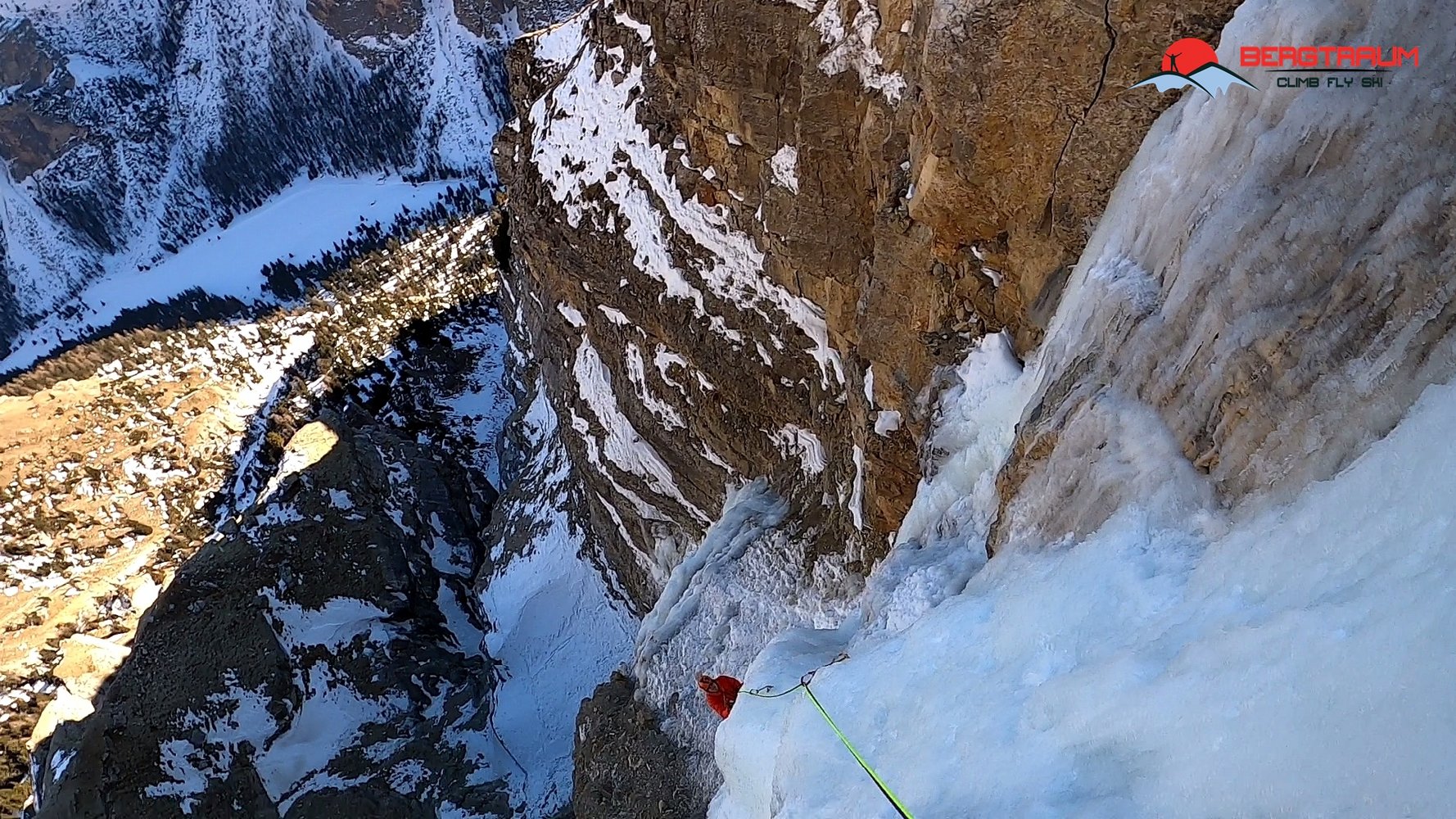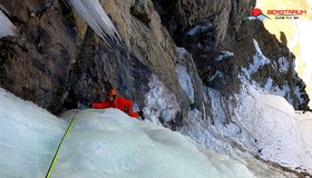 Wunderschöner Eisfall in imposanter Umgebung- Zustieg lang und etwas unbequem. Die ersten Meter der ersten Seillänge haben oft schlechtes Eis. Bei viel Eis kann man in der schmalen Rinne bzw. Verschneidung, die rund 100 Höhenmeter über dem Einstieg der Zauberflöte beginnt, zwei Seillängen zusätzlich im Mixedgelände- M7- anhängen. Diese Rinne führt direkt zum eigentlichen Einstieg des Eisfalls hinauf.