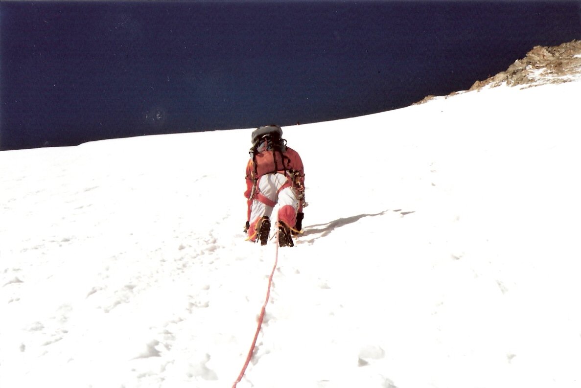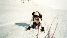 Gletscherausrüstung, Seil (50 m), Eisgeräte, Eisschrauben, Band- und Reepschnurschlingen, eventuell kleines Keilsortiment oder Friends mittlerer Größe (2 1/2, 3).