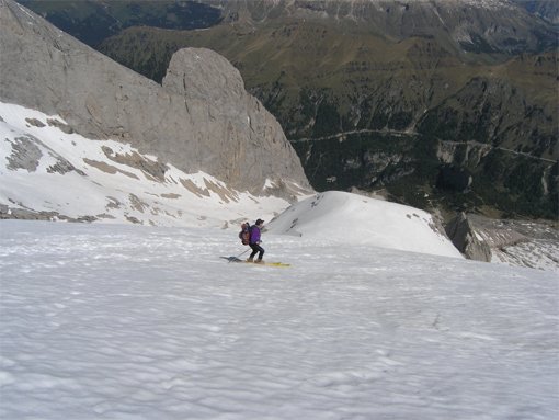 Wenn in der Engstelle am Einstieg kein Eis oder Schnee mehr ist, können Kletterstellen bis zum 4ten Grad auftreten (ungute Platten, also besser die Wand vorher von der Fedaiapassstraße mit dem Fernglas erkunden).