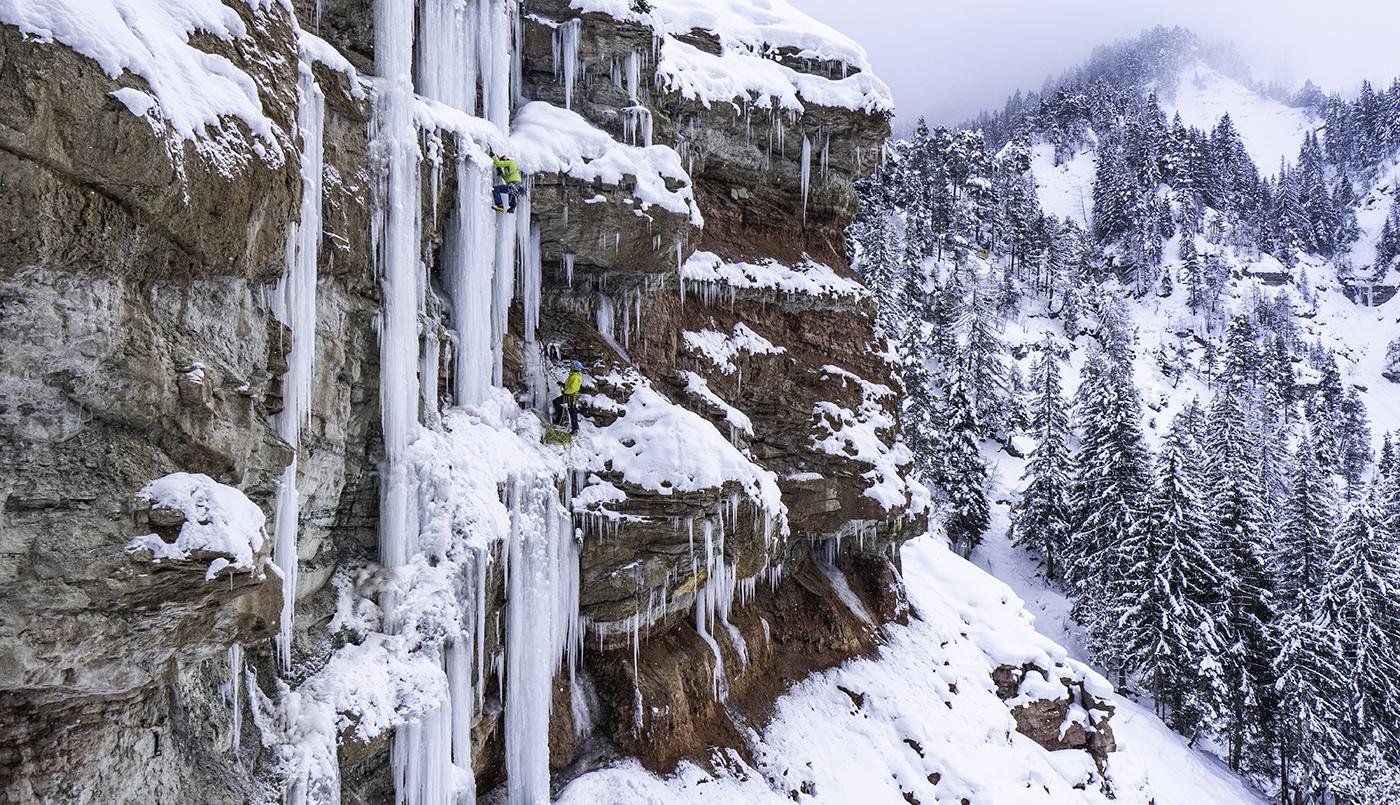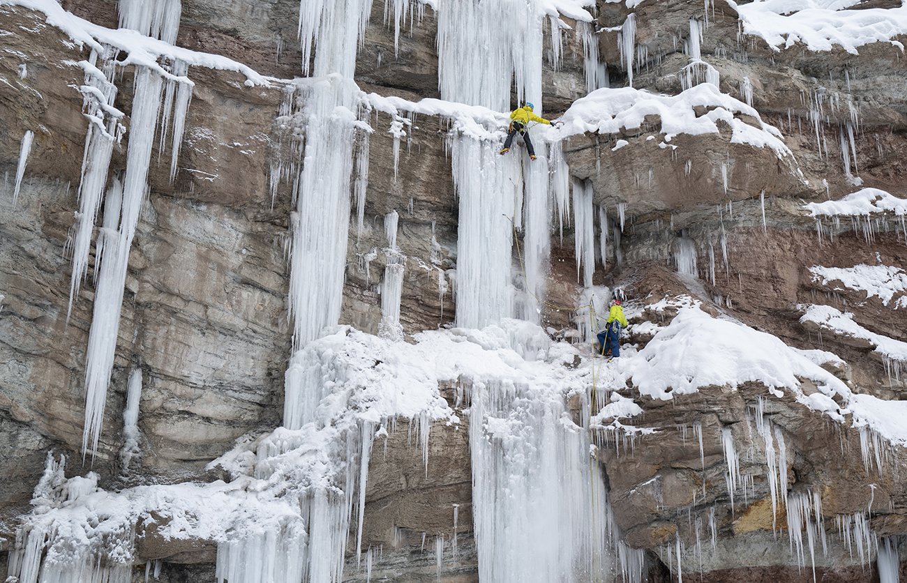 Absteilen von der ersten Baumreihe am Ende des Eisfalls. Wir haben dort eine Repschnur um einen Baum gebunden. Zwei mal Abseilen (80 Meter) , einmal wird eine Eisuhr benötigt. Danach absteigen zum Weg und wie Zustieg retour.