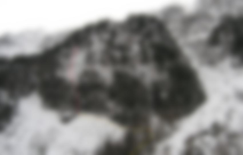 Interessanter Anstieg rechts vom rechten Nordportalfall. Die Route verläuft unten durch ein enges Gully, in dem es meist nur eine dünne Eisauflage gibt. Die Ausstiegsseillänge verläuft über ein breites Eisschild.