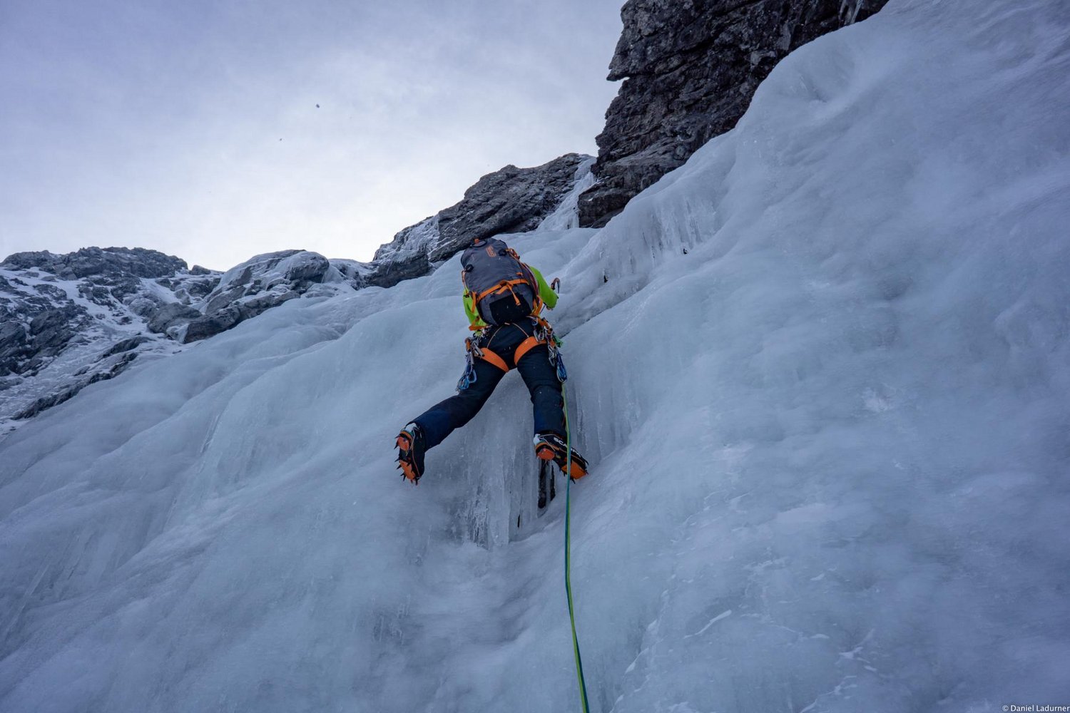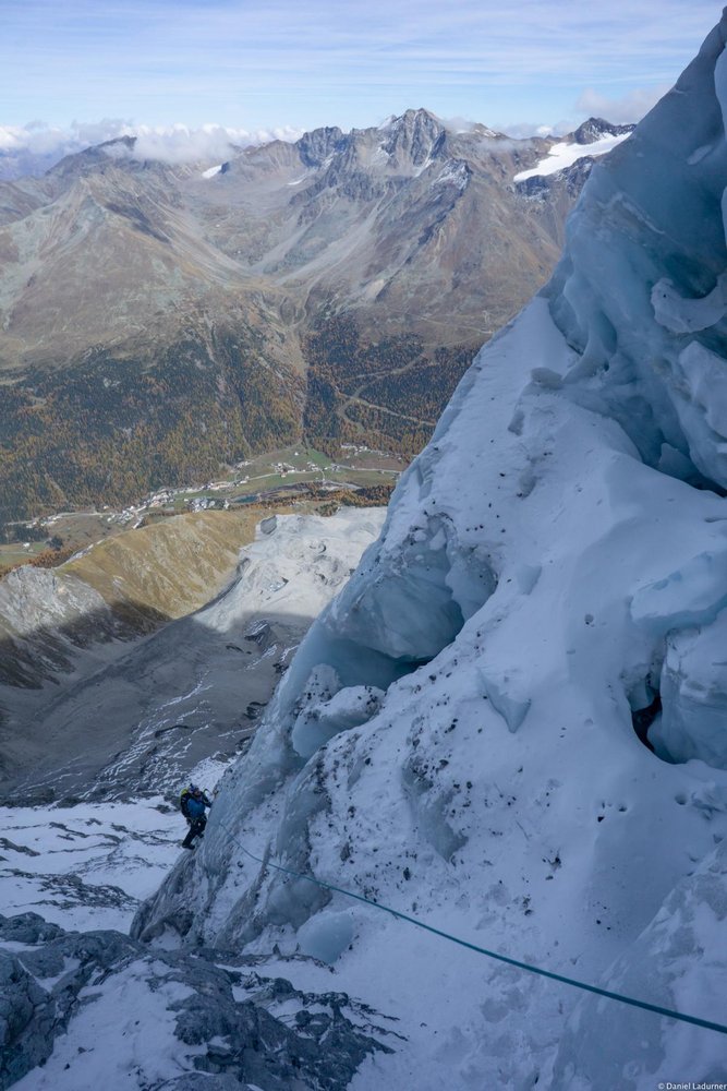 Vom Einstieg im kesselartigen untereren Teil der Wand (bis max. 3) ca. 300 m hinauf zum ersten Steilaufschung. Hier in einem Linksbogen über delikate Platten, Verschneidungen und Bänder zu einem markanten Wasserfall, der hinauf zum Gletscher führt. Insgesamt haben die Erstbegeher ca. 17 Seillängen, 6 davon im reinen Eis gesichert. Die letzten drei Eislängen (ca. 80 m) führen über ein Serac hinauf zum ersten Gletscher des klassischen "Hintergrats" hinauf, wo die Tour endet.