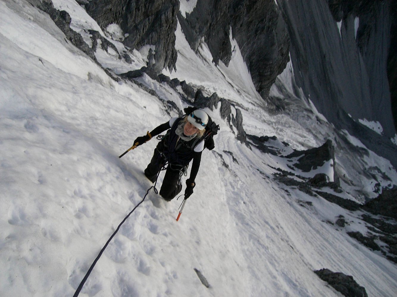 Vorsicht: Der untere Wandteil ist durch einen Eisbruch rechts oben am Gipfelplatau extrem gefährte. Oft unkontrollierter Serac Abbruch direkt in die Nordwand hinein!!!!