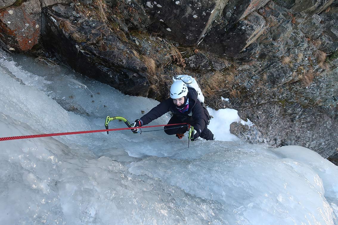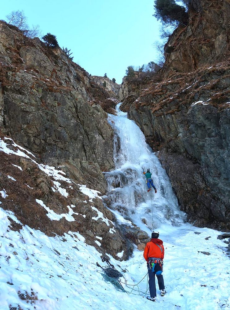 Eine Tour für Leute, die auch an flacheren Eispassagen in einer landschaftlich schönen Rinne Spaß haben. Mehrere Aufschwünge bis WI3+ und oben WI4.