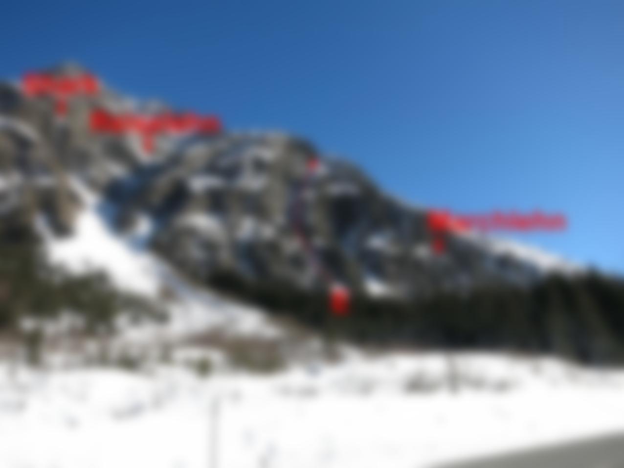 Sehr lawinengefährlich und nur bei sehr geringer und sicherer Schneelage möglich. Fast die gesamte Rinne hat Eis (zumindest im Februar 2017), welches aber in den flacheren Passagen unter Schnee versteckt ist und eine gefährliche Lawinenrutschbahn bilden kann.