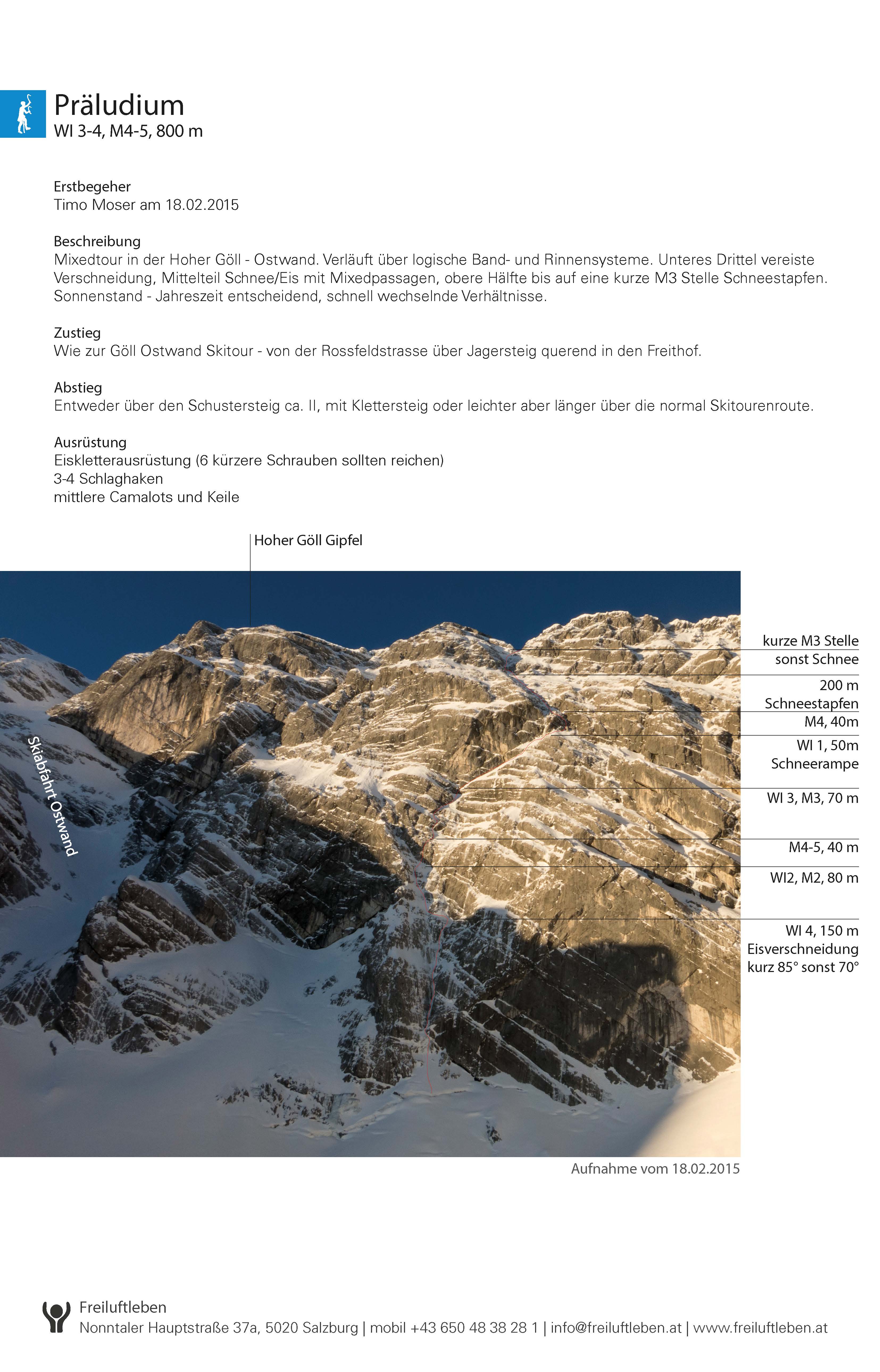 Mixedtour in der Hoher Göll - Ostwand. Verläuft über logische Band- und Rinnensysteme. Unteres Drittel vereiste Verschneidung, Mittelteil Schnee/Eis mit Mixedpassagen, obere Hälfte bis auf eine kurze M3 Stelle Schneestapfen. Sonnenstand - Jahreszeit entscheidend, schnell wechselnde Verhältnisse.