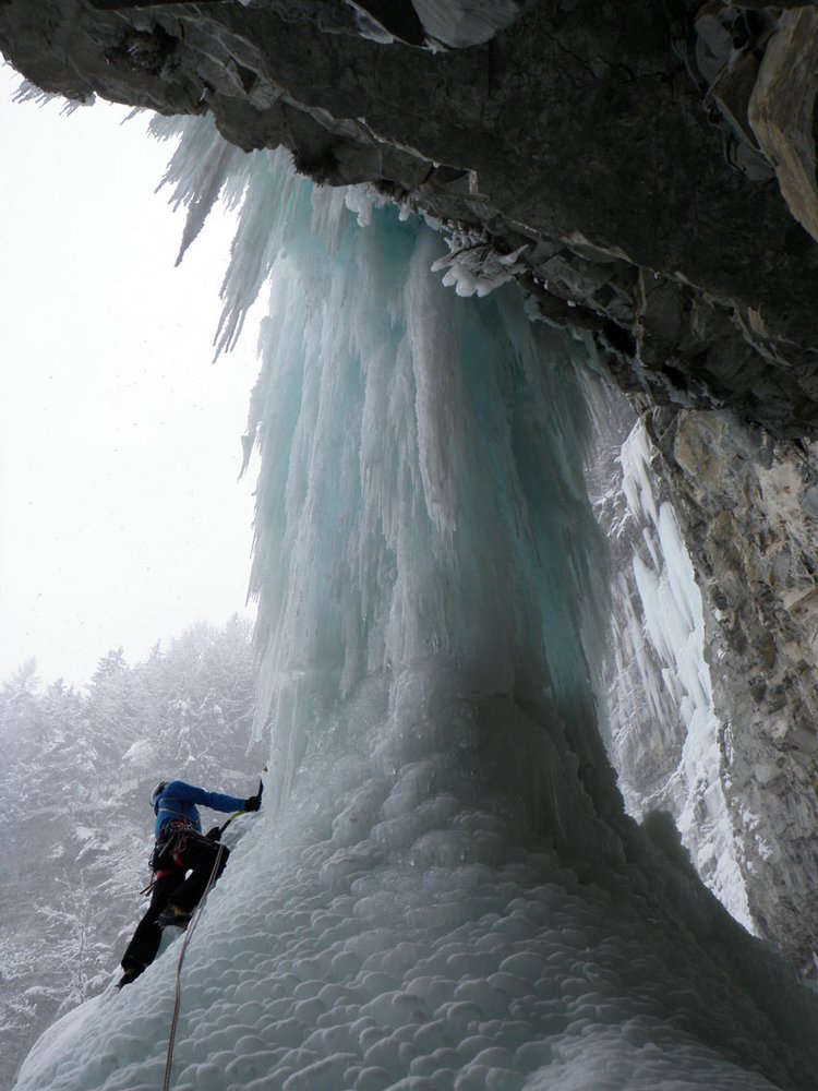 Extreme Eiskletterei an instabilen Eisvorhang, mit überhängenden Eisbalkonen. Der Name entspricht den Gegebenheiten.