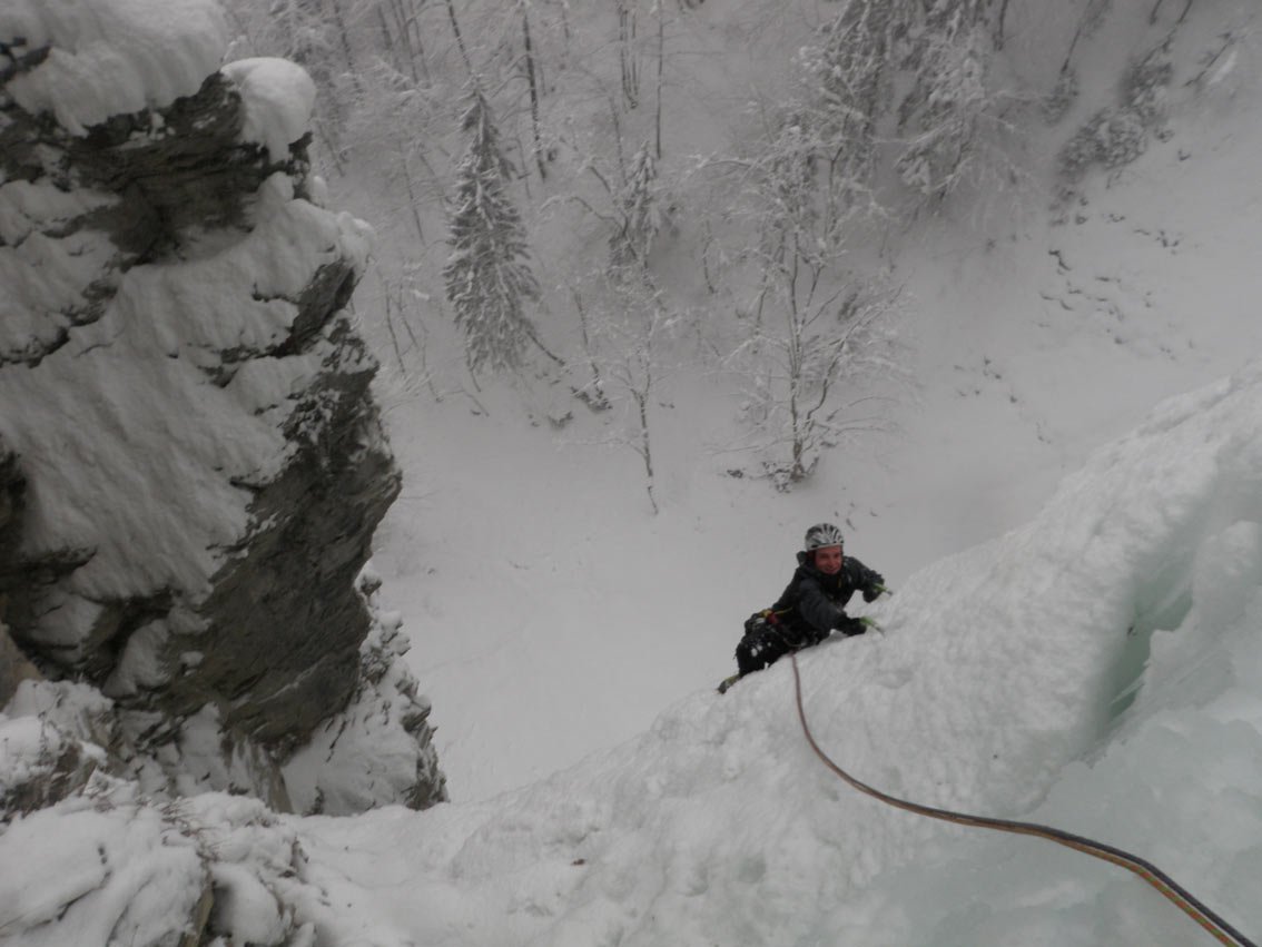 Ca. 50 Hm über steiles Waldgelände aufsteigen, dann orografisch ganz rechts über einen Eisgully Abseilen. Über den Eisfall Abseilen ist nicht anzuraten. Über Felsen Abseilen ist ebenfalls nicht zu empfehlen, da das Gestein sehr brüchig ist und sehr viele große Brocken locker sind.