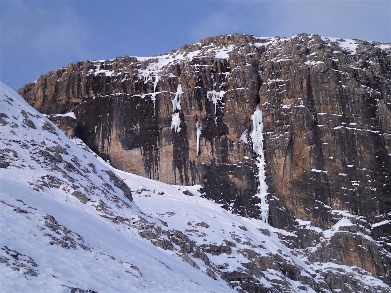 Rechts der Route Stella Cadente - Sternschnuppe befindet sich noch eine schöne drei Seillängen Route, die sich auch nur selten bildet. Die Route befindet sich im unteren Teil gegenüber dem Piz da Lech, ausgerichtet nach Osten, auf 2550 m.