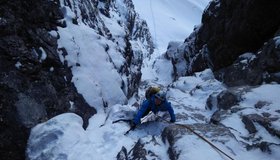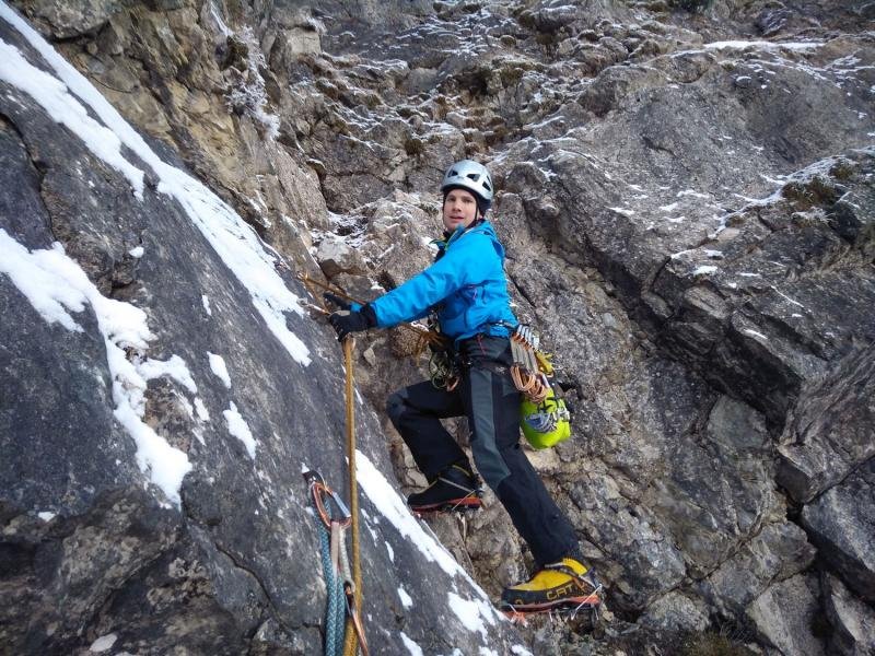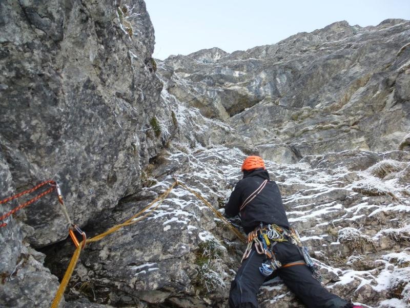 60m Doppelseil (zum Abseilen zwingend erforderlich), ein Satz Camalots von 0,3-3, ca. 8-10 Expressen, Bandschlingen, an sich keine Eisschrauben notwendig, lediglich bei Verhältnissen mit übermäßigem Eisvorkommen kann eine ganz kurze 10cm Schraube nicht schaden. Als Backup in solchen Touren, sind immer auch ein paar Normalhaken und 1-2 Spectre Icepitons von Vorteil. Schließlich ist es ja eher die Regel wie die Ausnahme, dass nicht immer alle Bohrhaken in Mixedtouren gefunden werden.