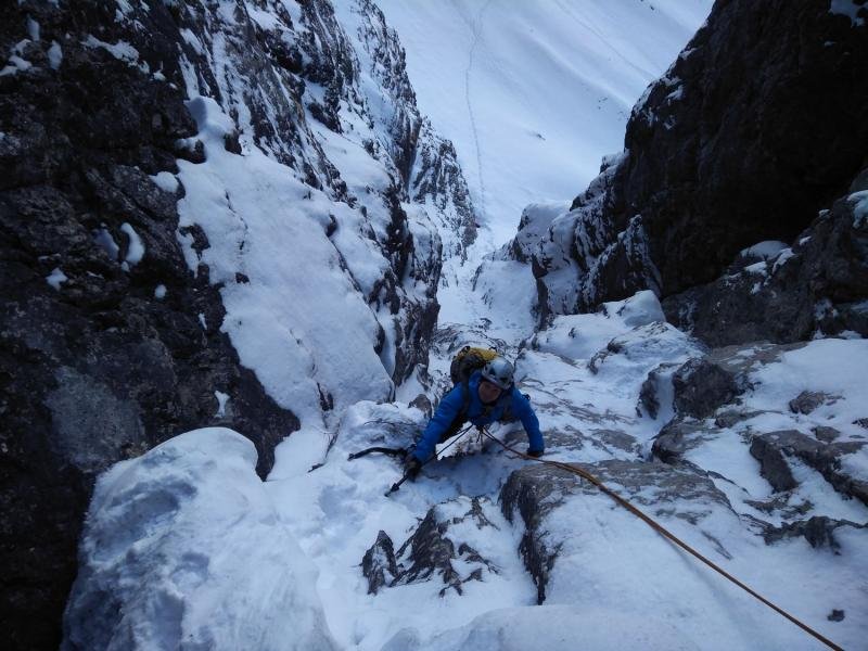 Verhältnisse: Wie in fast allen gängigen Mixedrouten am Rubihorn, so ist auch in „Rubi Love“ Klettergenuss sehr von den Verhältnissen abhängig. Idealverhältnisse findet man bei gut gesetztem Schnee, Minustemperaturen und durchgefrorenen Graspolster vor. Ein wenig Eis kommt ausschließlich in der 3. SL vor. Eis in dieser Länge erleichtert zwar eine Begehung, ist aber nicht zwingend erforderlich. Grundsätzlich hatten wir an allen drei Tagen in der Tour unterschiedliche Verhältnisse und damit auch gleich einen markant anderen Charakter vorgefunden.