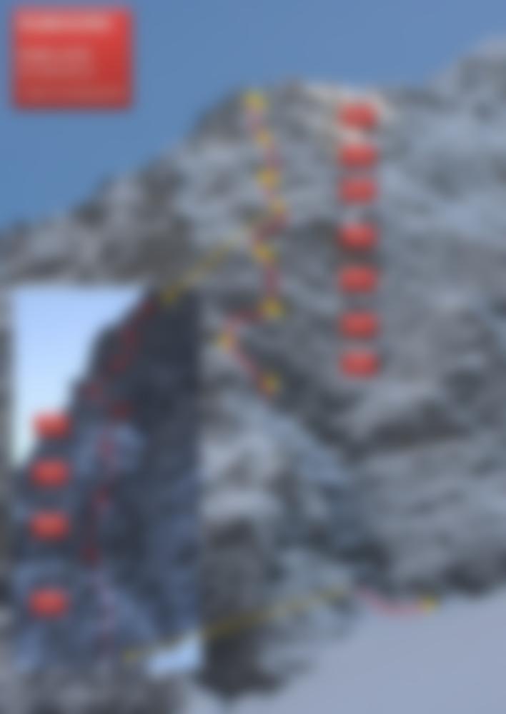 Tobias Bailer und Marcel Dettling am 13.01.2018. Nach zwei Tagen Vorarbeit. Die Erstbegehung erfolgte durchgehend im Vorstieg von unten ohne die Verwendung von Fixseilen. Erste Wiederholung durch Fabian Buhl und Sebastian Brutscher 11.03.2018.