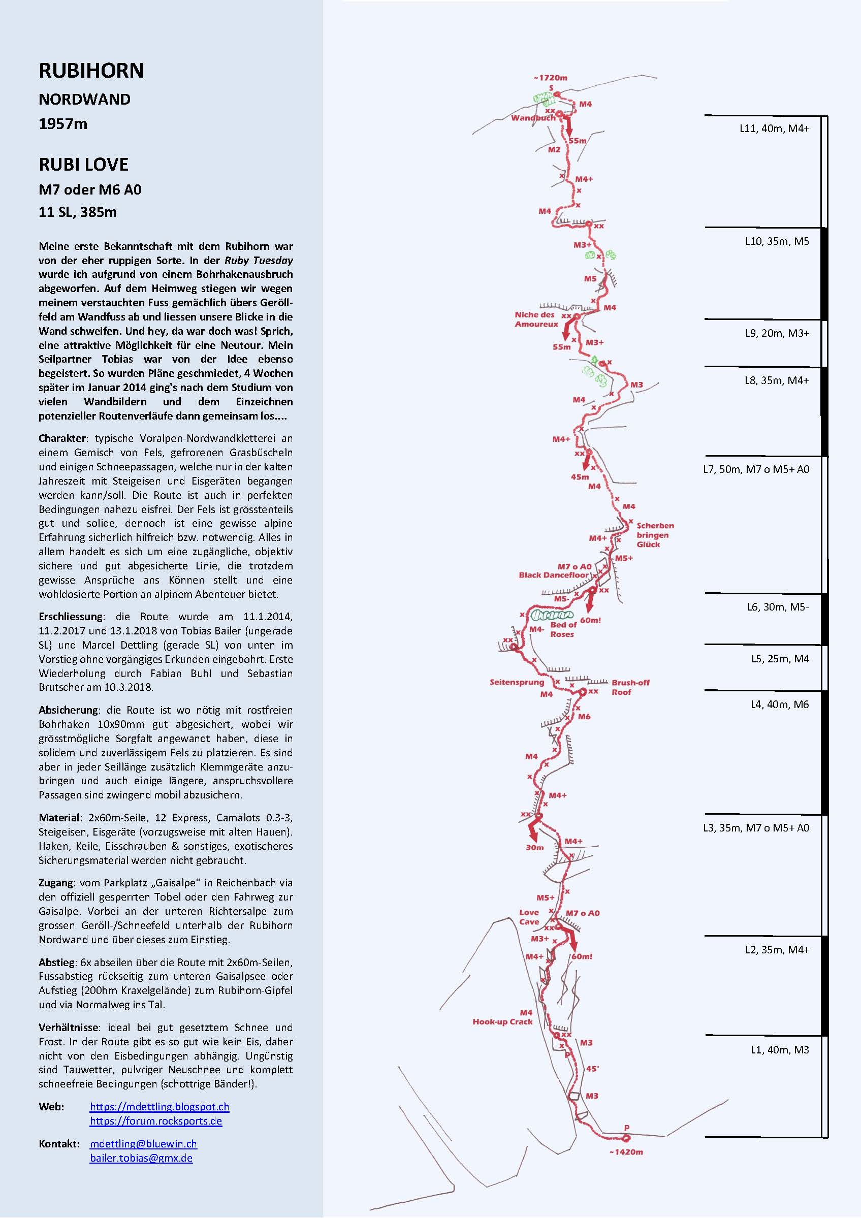 Die „Rubi Love“ bietet überwiegend klassische alpine Allgäu-Like-Mixed-Kletterei, wie sie am Rubihorn und am Aggenstein vielfach anzutreffen ist. Aufgrund des häufig graslastigen Geländes ist die Kletterei meist sehr dankbar. Tendenziell kann man sagen, dass der Grasanteil mit zunehmender Wandhöhe steigt, gleich wie in den benachbarten Routen „Osterspaziergang“ und „Ice on the Rocks“. Aber auch der rein felserprobte Mixedkletterer kommt auf seine Kosten und hat bei freier Kletterei in den Passagen „Love Cave“ und „Black Dancefloor“ ordentlich zu tun. Ein Stand ist gemeinsam mit der Route „Osterspaziergang“. Die Route eignet sich insgesamt auch gut für den Einstieg ins anspruchsvollere alpine Mixedklettern. Zum einen aufgrund der soliden Grundabsicherung zum anderen aufgrund der guten Rückzugsmöglichkeiten.