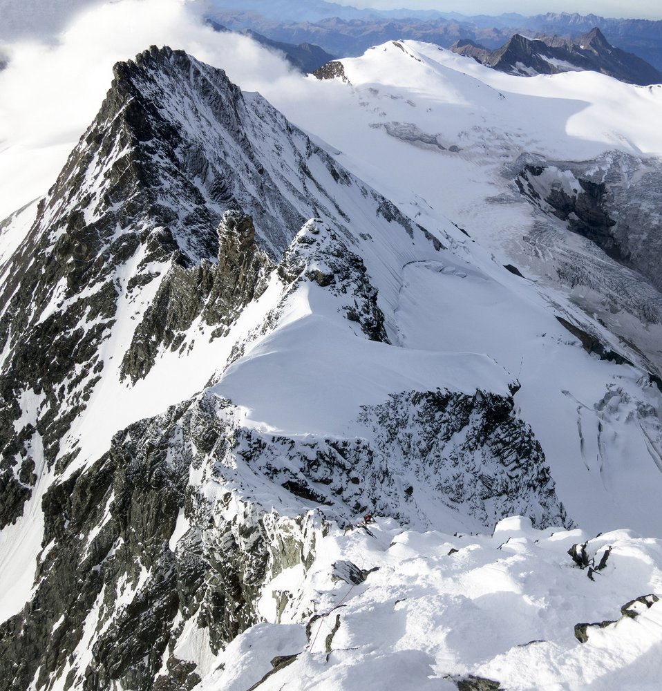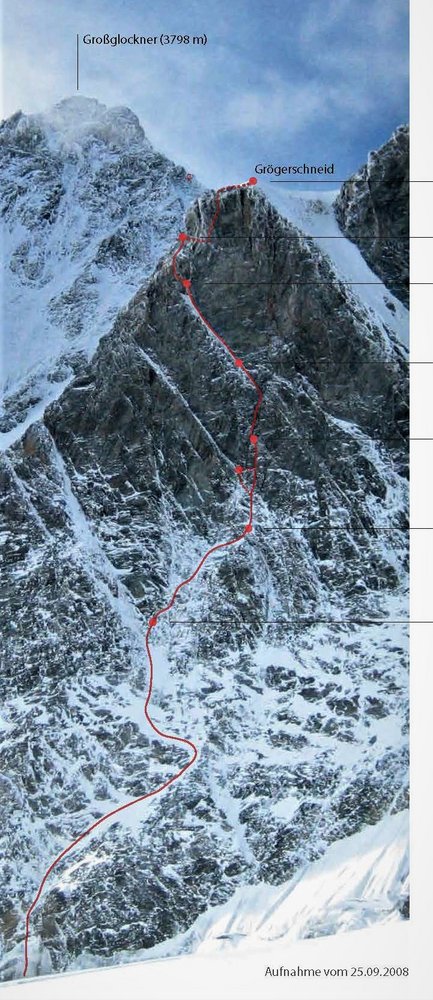 Von der "Grögerschneid" 3660 m, über den NW-Grat (140 m langer Gratanstieg bis 4- der bei Schneelage nicht zu unterschätzen ist) zum Gipfel. Man kann auch von der Grögerschneid über die "Grögerrinne" 40 - 45° und danach über das Teischnitzkees zur Stüdlhütte absteigen - also von der Grögerschneid über steile Firnfelder nach Süden hinunter.